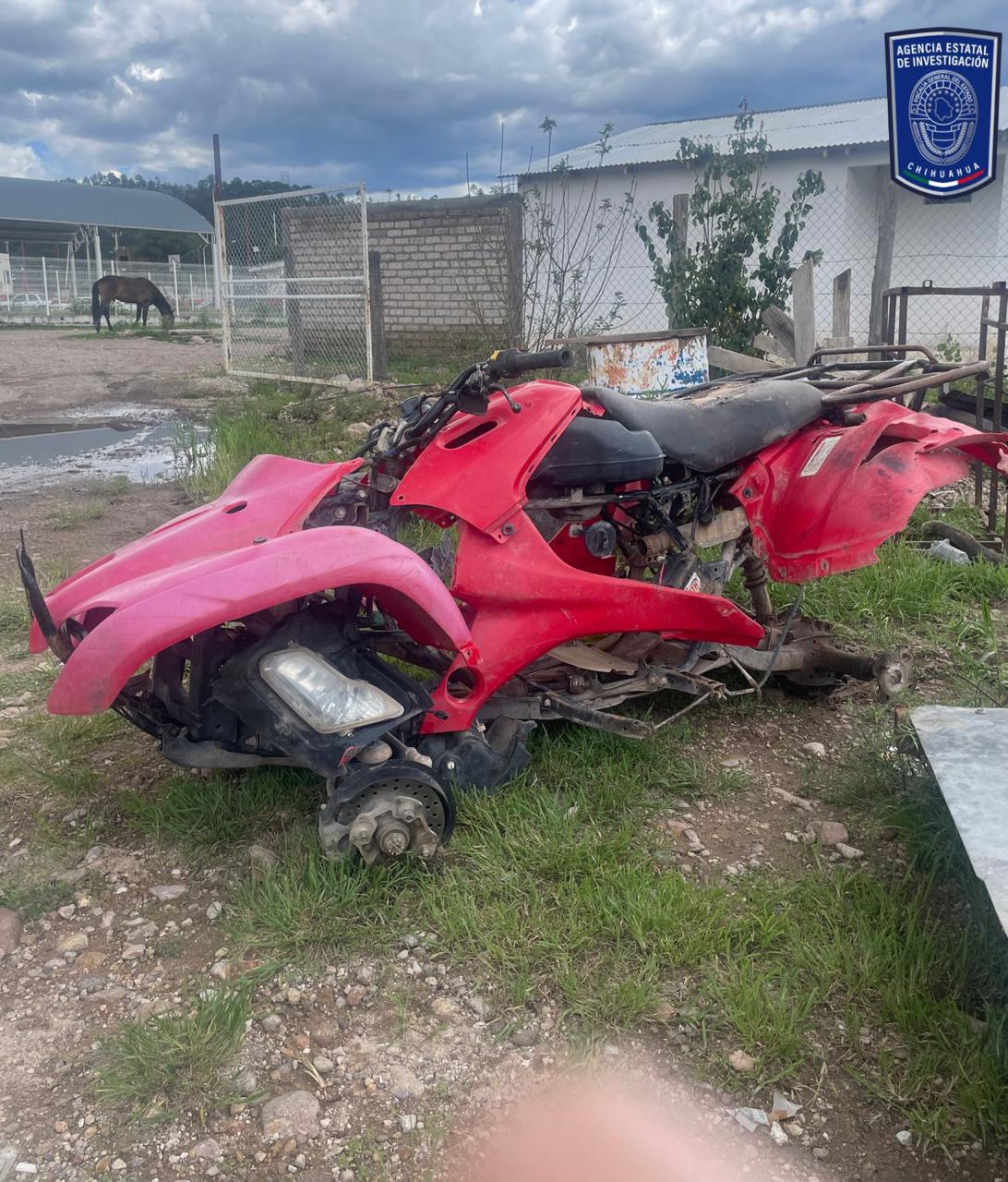 También se aseguró una cuatrimoto que se encontraba desmantelada, esta de la marca Honda, 420 CC., color rojo, modelo 2010, la cual tenía reporte de robo del día 01 de marzo del 2021 en ciudad Cuauhtémoc, Chihuahua.