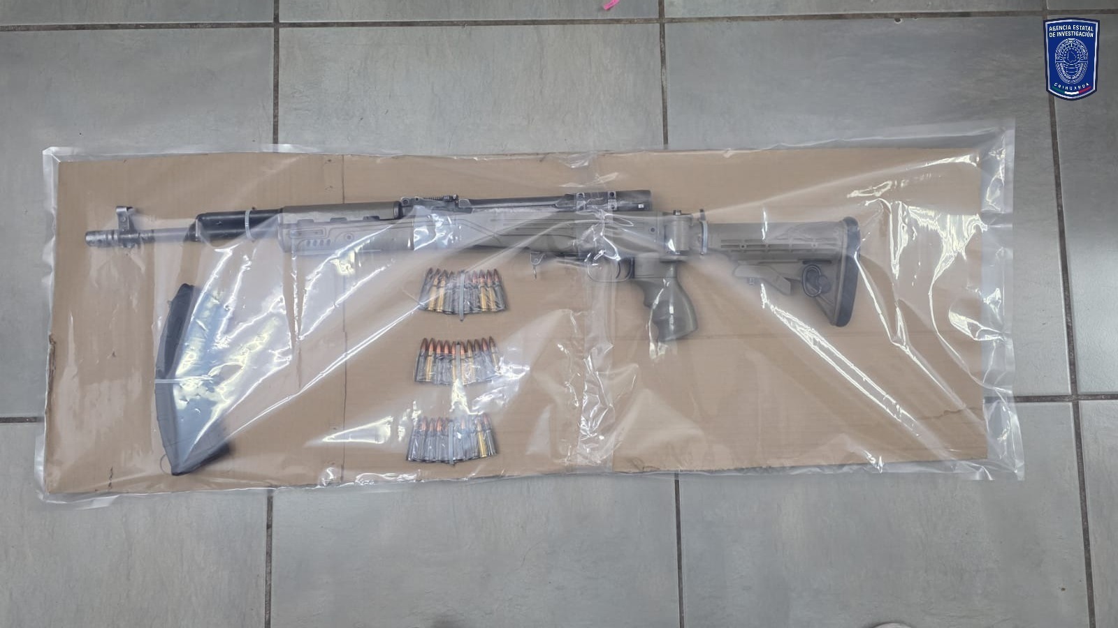 Los elementos hallaron en el interior del mencionado vehículo, un arma larga tipo fusil, calibre 7.62 x 39 mm., abastecida con 30 cartuchos útiles en el cargador, la cual fue asegurada por personal de Servicios Periciales para las pruebas de balística forense.