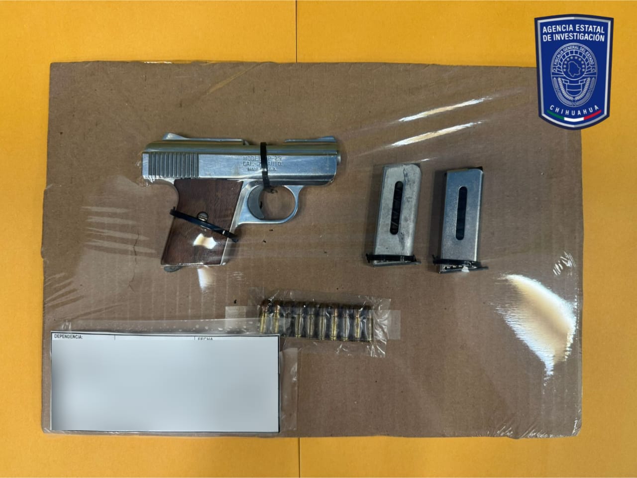 Lo asegurado fue; un arma de fuego tipo pistola calibre .25 con dos cargadores color plateado abastecidos con diez cartuchos útiles con la leyenda WIN 25 auto; un arma de fuego tipo pistola calibre 38, abastecida con cinco cartuchos útiles y 77 cartuchos útiles con la leyenda WIN 25 auto.