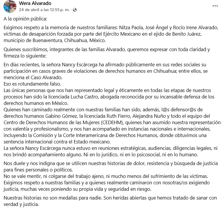 “La señora Nancy Escárcega nunca estuvo en reuniones estratégicas, audiencias, diligencias legales, ni nos brindó acompañamiento alguno. Ni en lo jurídico, ni en lo psicosocial, ni en lo humano”, cita el mensaje de la Familia Alvarado.