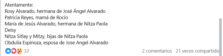 Por lo anterior, la familia Alvarado “exigió respeto tanto a sus familias y a quienes realmente caminaron con nosotras/os exigiendo justicia, muchas veces poniendo su propia vida y seguridad en riesgo. Nuestras historias no son medallas para nadie. Son heridas abiertas que hemos tratado de sanar con verdad y justicia” concluyeron.