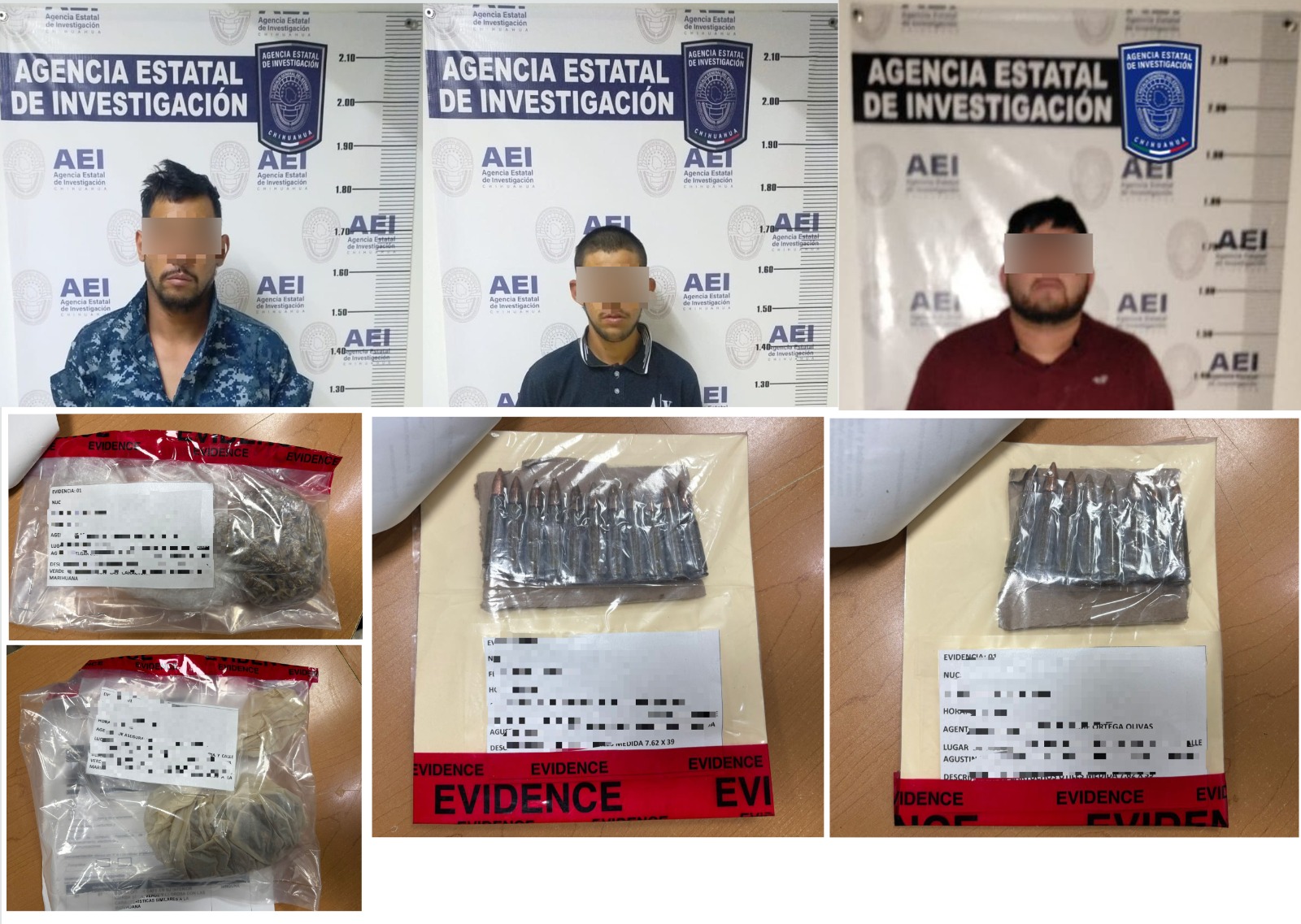 Al continuar la vigilancia, ahora sobre las calles Juan Escutia y Agustín Melgar, de la colonia La Abundancia, detuvieron en flagrancia por delitos contra la salud pública, a los C. Efrén Hilario H. M., de 31 años de edad, Adrián Alexis C. B., de 25 años de edad y César Uriel O. A., de 19 años de edad, sorprendidos en flagrancia por la portación de 31 cartuchos útiles calibre 7.62×39 y tres envoltorios de plástico que en su interior contienen una hierba con las características de la mariguana.