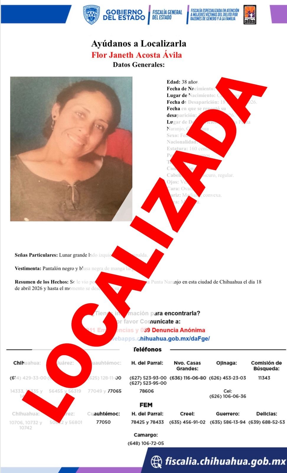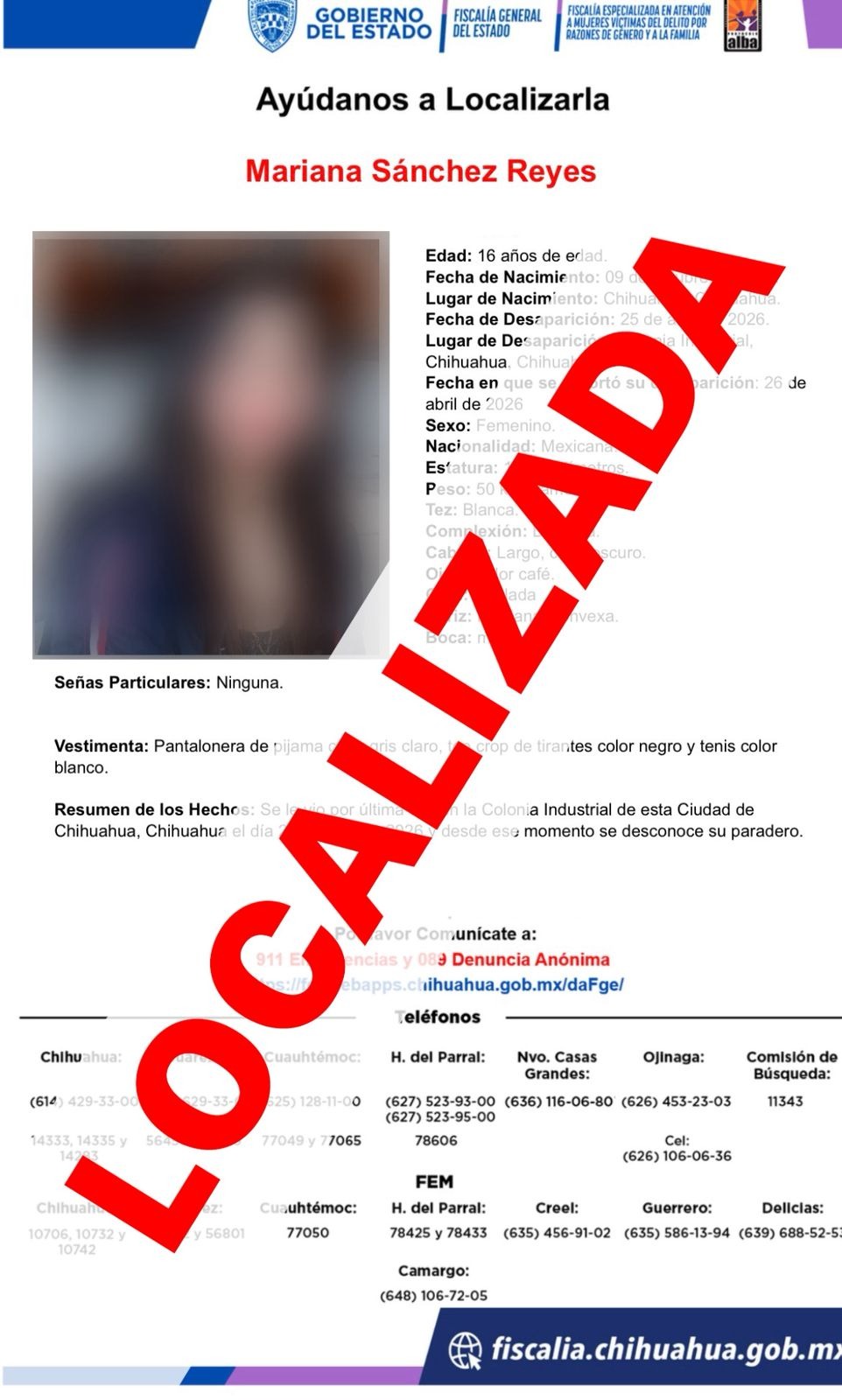 Las citadas personas contaban con reportes de ausencia interpuestos ante la Unidad de Niñas, Adolescentes y Mujeres Ausentes, en la ciudad de Chihuahua.