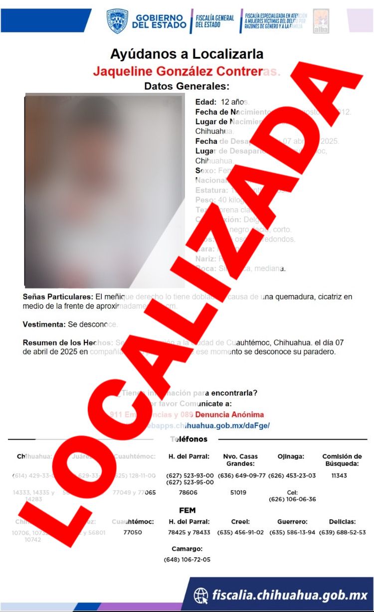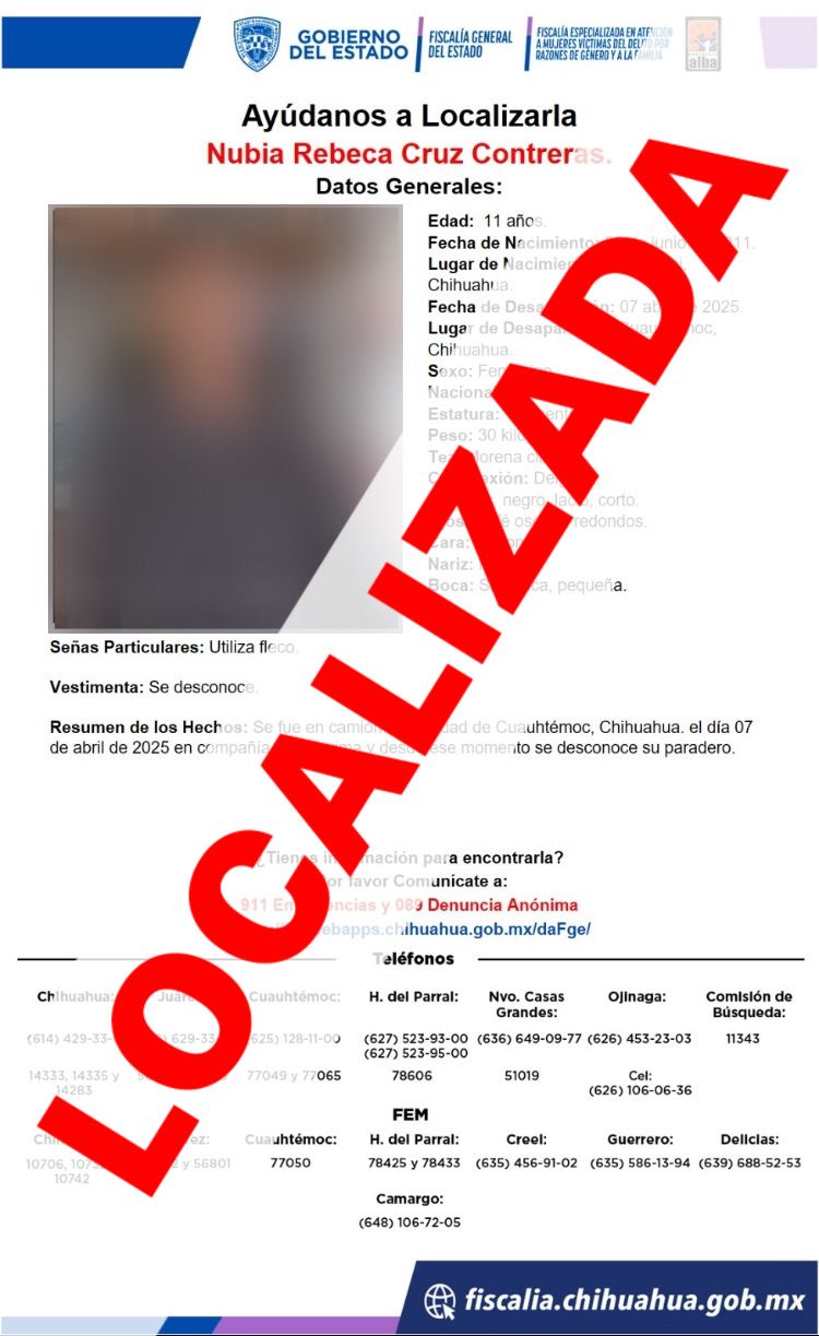 Con los elementos recabados y aportados por las familias, los Policías de la Agencia Estatal de Investigación, pudieron localizarlas en la colonia Lázaro Cárdenas de la ciudad de Cuauhtémoc.