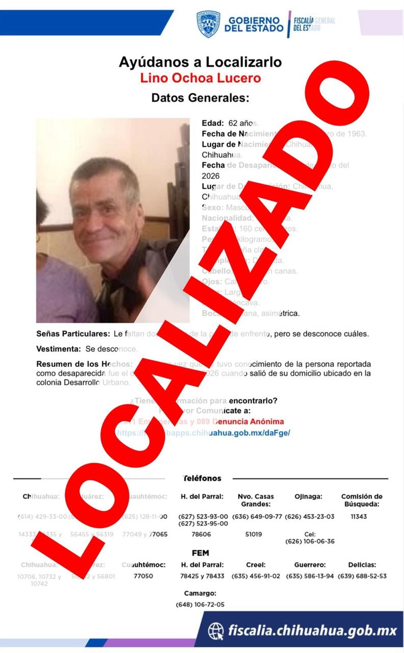 Mediante la activación de los protocolos de búsqueda, fueron localizados en diferentes hechos, César Lorenzo M.M., de 29 años de edad, y Lino Ochoa Lucero, de 62 años de edad.