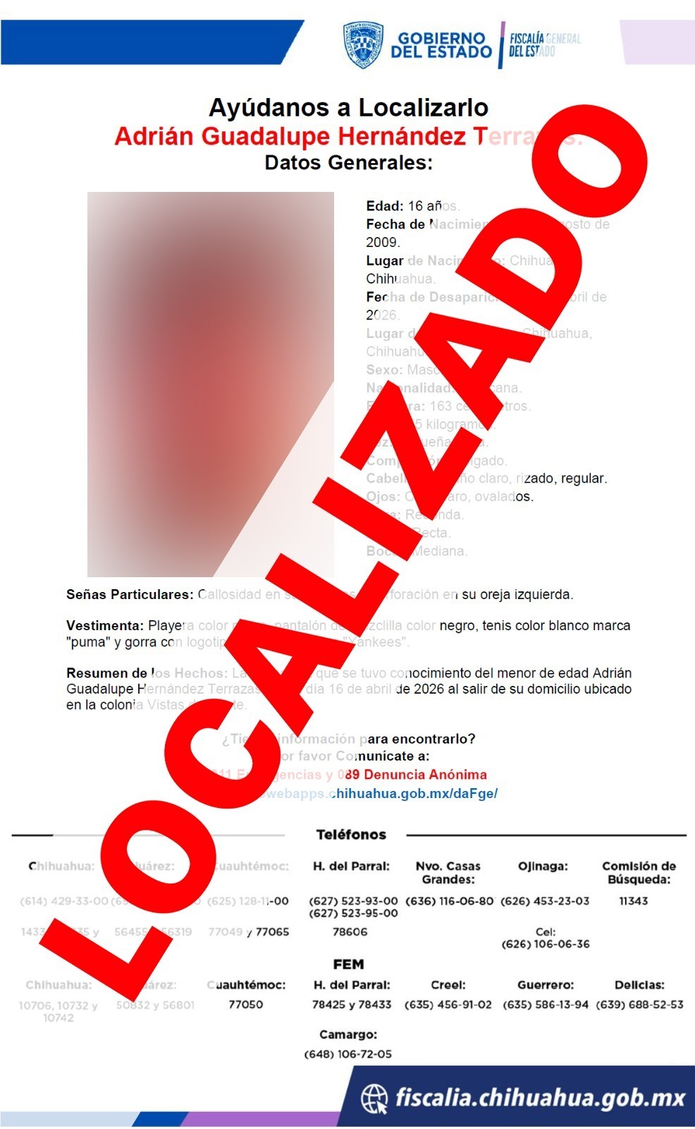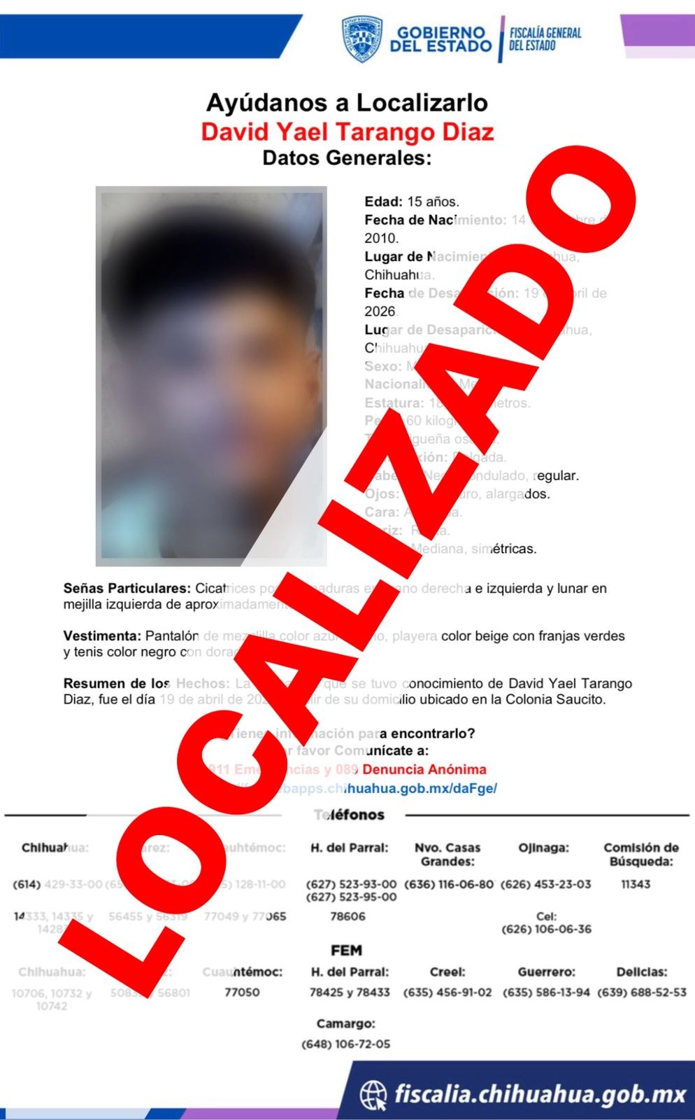 Mientras que, ayer martes 21 de abril, localizaron al adolescente de iniciales D.Y.T.D., de 15 años de edad, en una vivienda de la calle Pelícano, en la colonia Saucito.