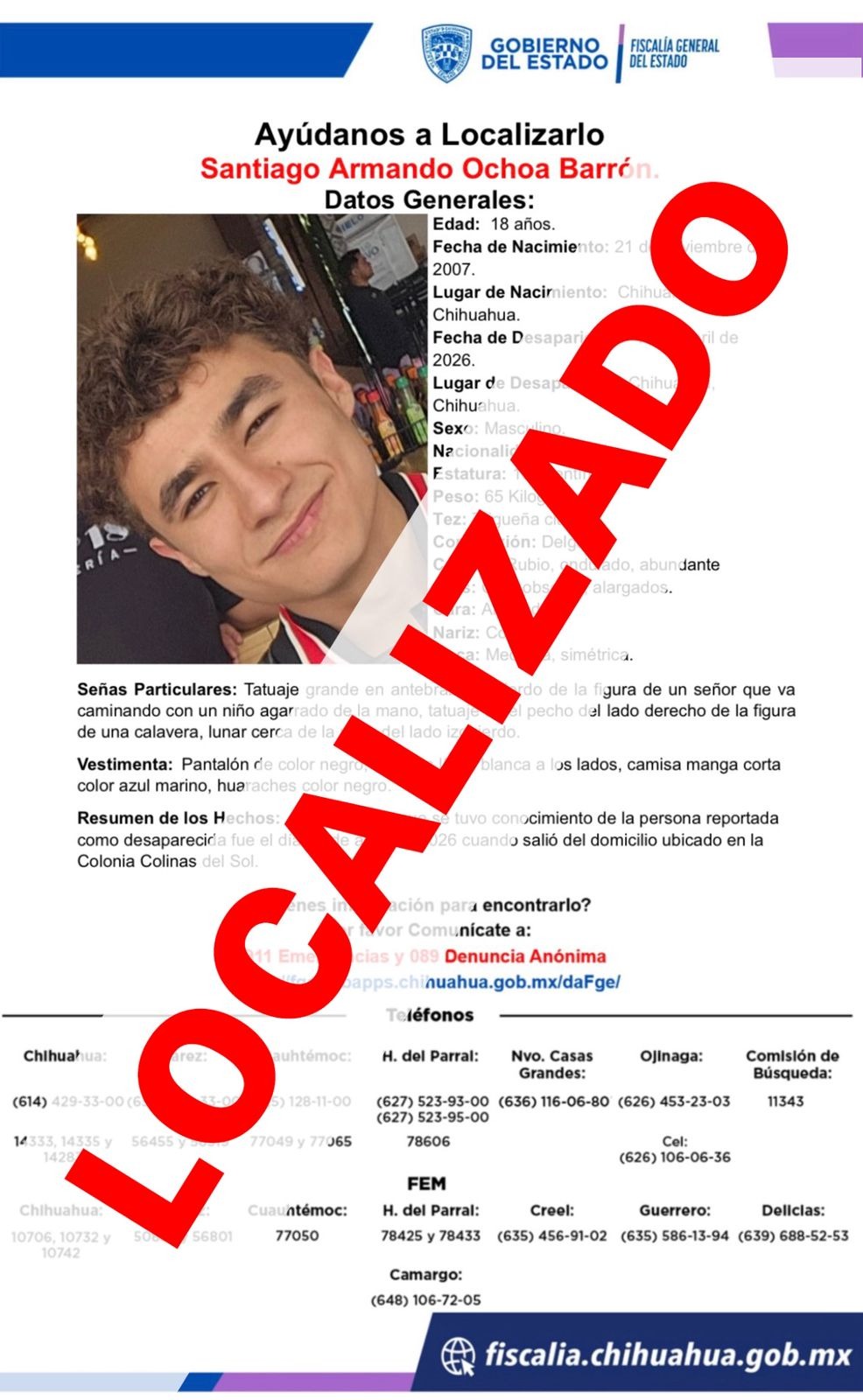 De la misma manera, este miércoles 22 de abril, localizaron a Santiago Armando O. B., de 18 años de edad, en una casa de la calle Avestruz, de la colonia Colinas Del Sol.