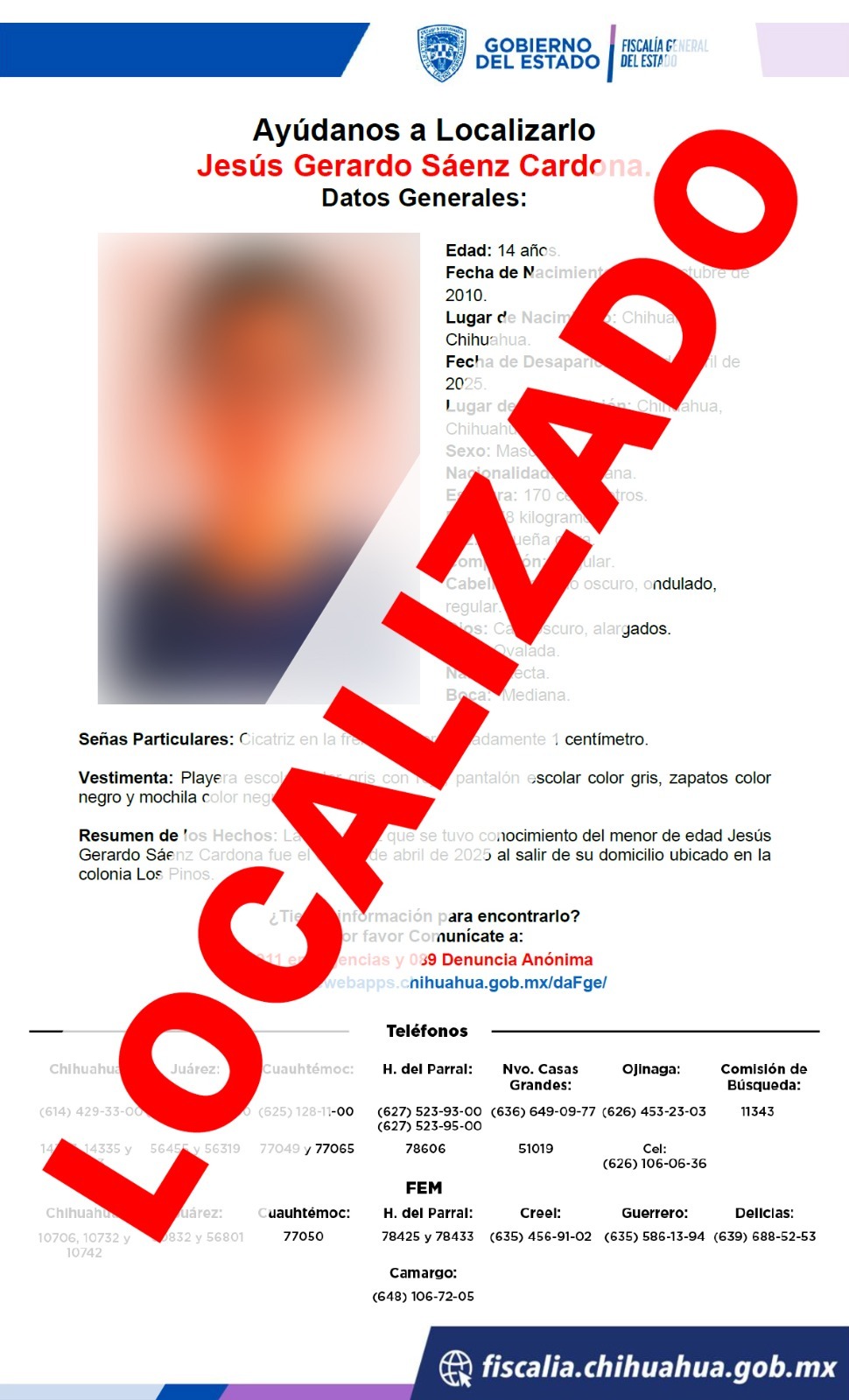 Los menores localizados, de iniciales J.G.S.C de 14 años de edad y M.A.S.R., de 14 años de edad, ya se encuentran de nueva en sus respectivos hogares bajo el cuidado y tutela de sus padres.