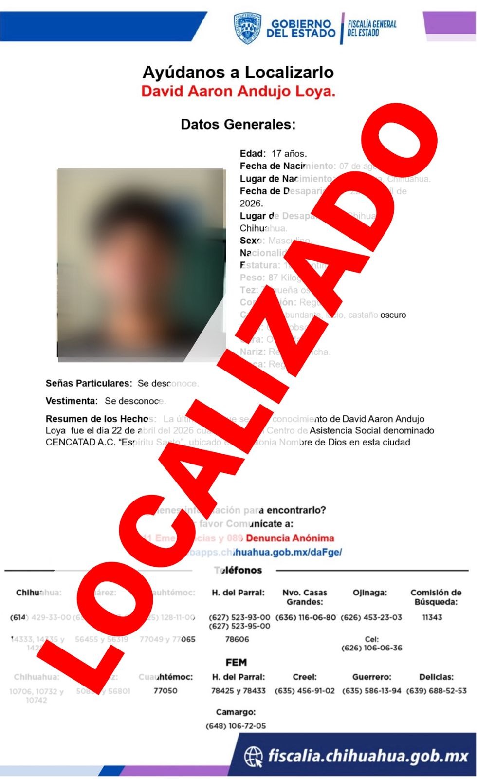 La Fiscalía General del Estado refrenda su compromiso de realizar las acciones necesarias para dar con el paradero de todas las personas con reporte de ausencia y/o no localización, a fin de dar certeza a sus familias.