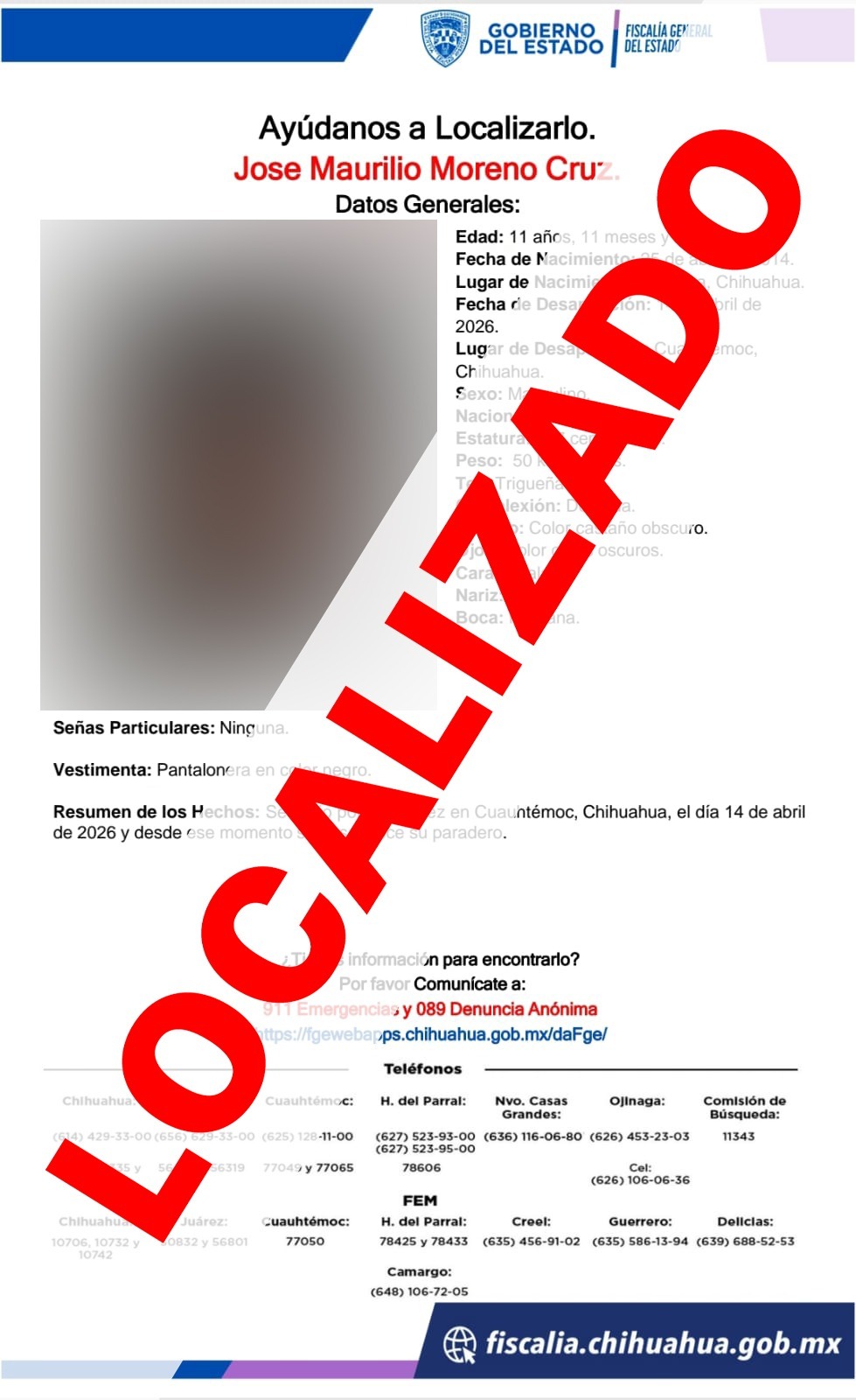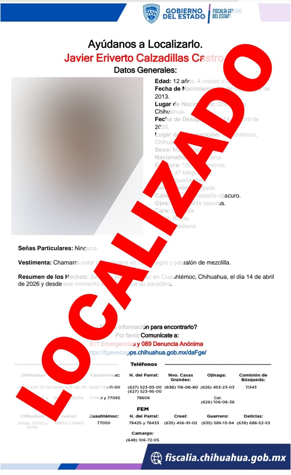 La Fiscalía de Distrito Zona Occidente, localizó sanos y salvos a seis menores de edad, quienes el pasado martes 14 de abril se salieron sin autorización de un albergue de la ciudad de Cuauhtémoc, por lo que fue reportada su ausencia.