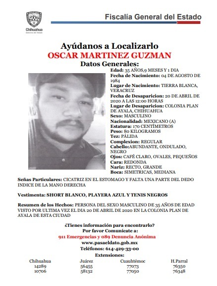 • Óscar Martínez Guzmán. Desapareció el 20 de abril del 2020 y fue visto por última vez en la colonia Plan de Ayala, de la ciudad de Chihuahua.