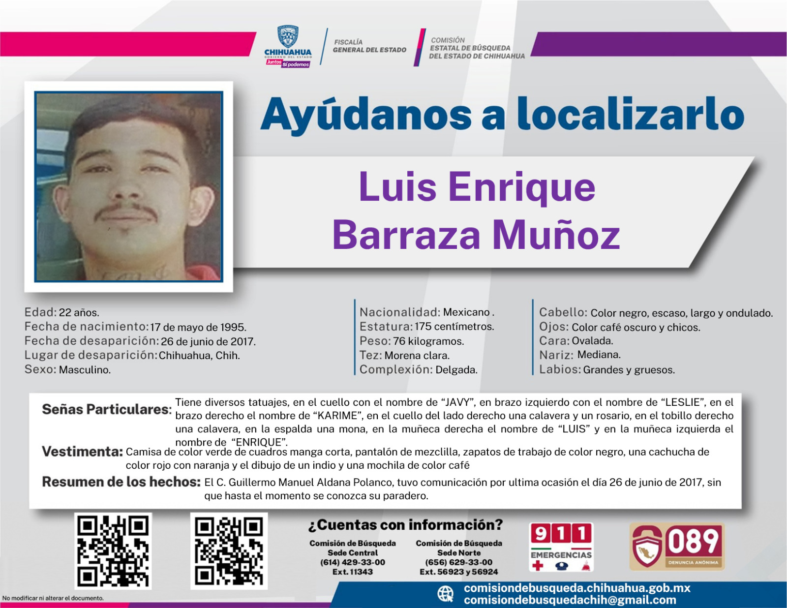 • Luis Enrique Barraza Muñoz. Desapareció el 26 de junio de 2017 y fue visto por última vez en la colonia 3 de mayo, de la ciudad de Chihuahua.