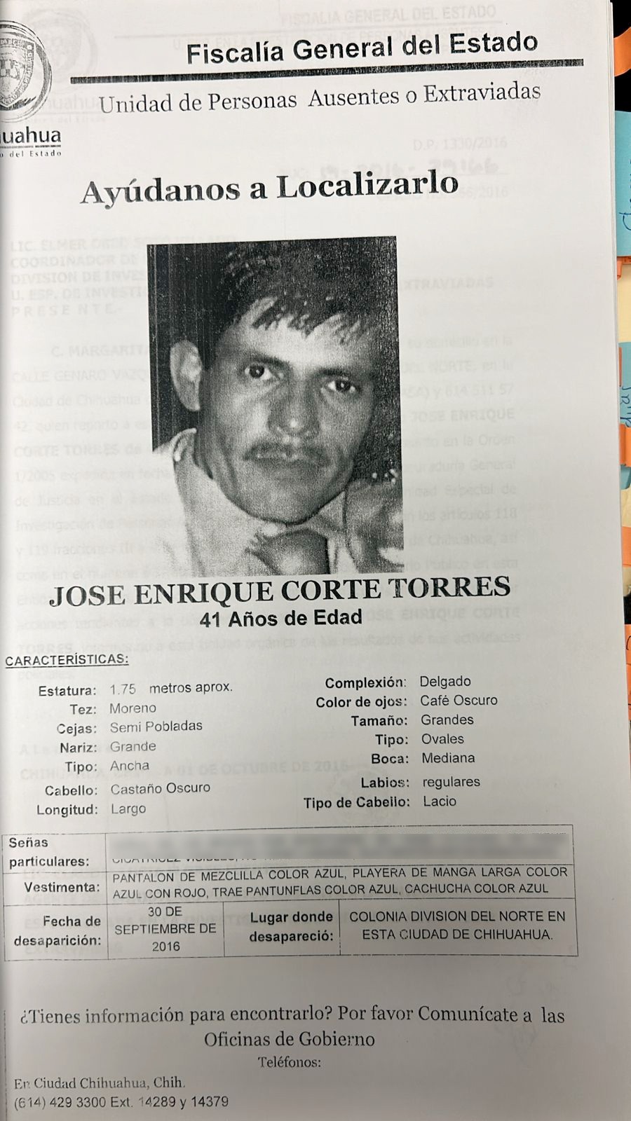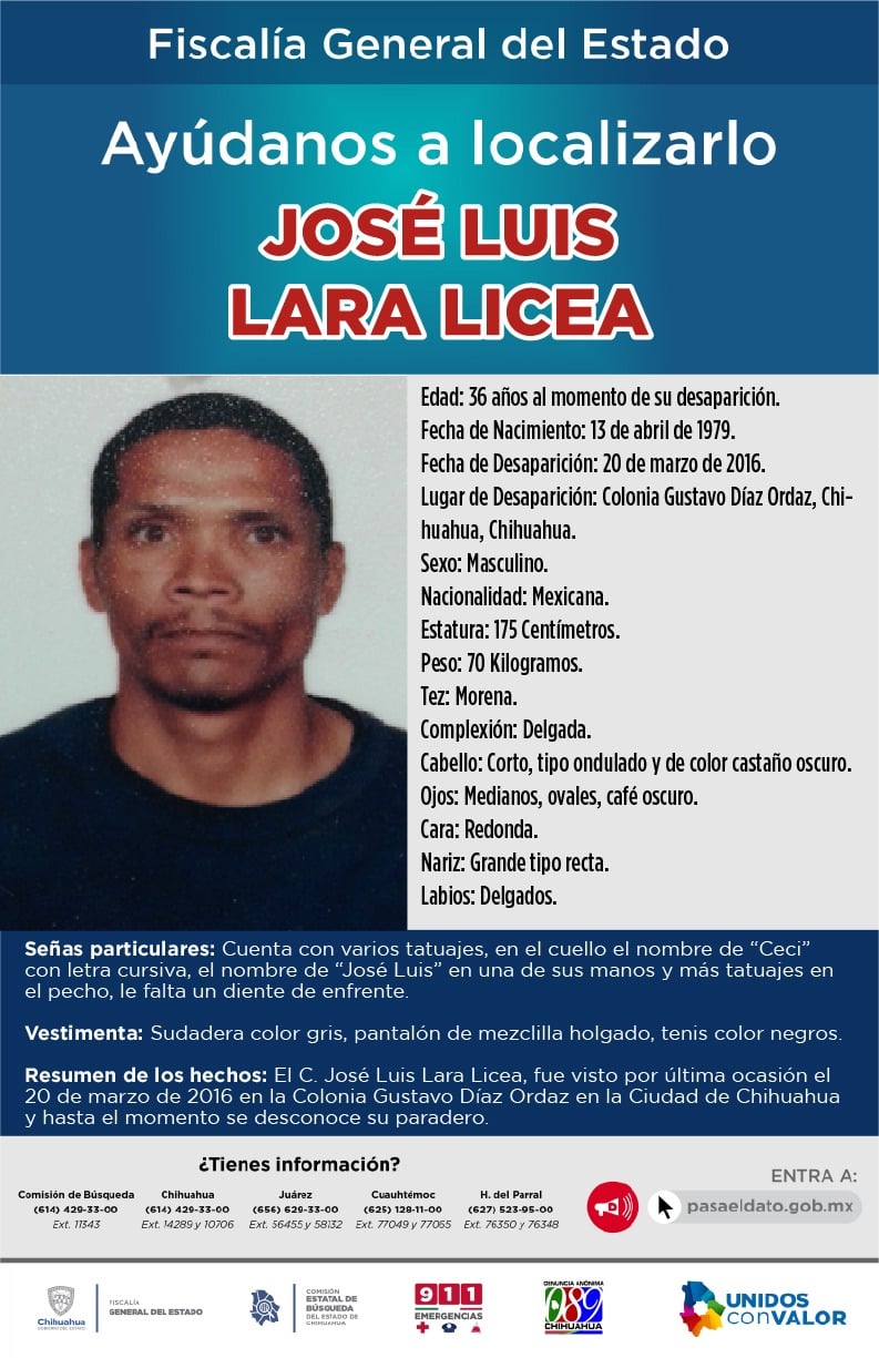• José Enrique Cortés Torres. Desapareció el 30 de septiembre de 2016 y fue visto por última vez en la colonia División del Norte, de la ciudad de Chihuahua.• José Luis Lara Licea. Desapareció el 20 de marzo de 2016 y fue visto por última vez en la colonia Gustavo Díaz Ordaz, de la ciudad de Chihuahua.