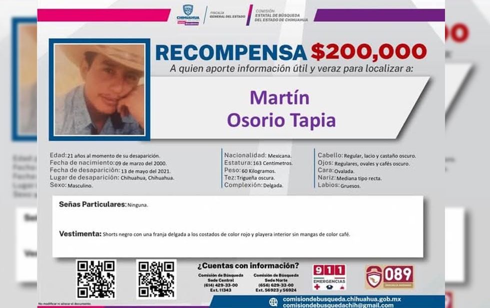 • Martín Osorio Tapia. Desapareció el 13 de mayo de 2021 y fue visto por última vez en la colonia Granjas Cerro Grande, de la ciudad de Chihuahua.