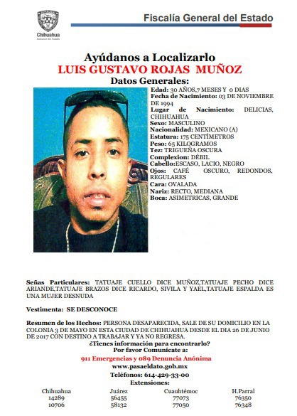 • Luis Gustavo Rojas Muñoz. Desapareció el 26 de junio de 2017 y fue visto por última vez en la colonia 3 de mayo, de la ciudad de Chihuahua.