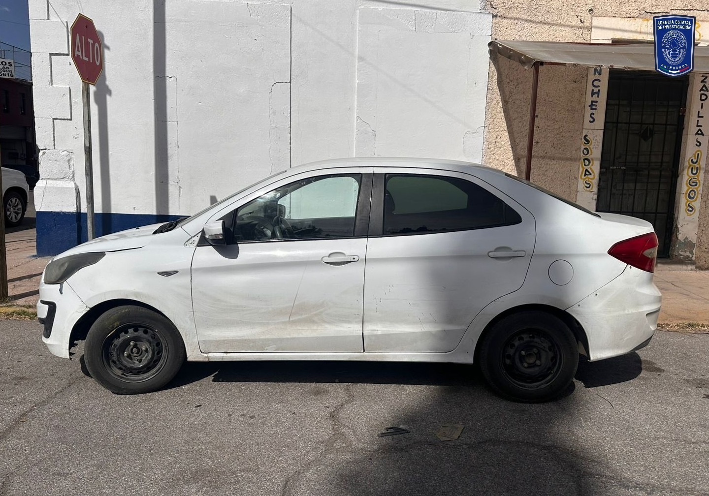 El tercer vehículo asegurado, es de la marca Ford, línea Figo, modelo 2019, color blanco, con placas de circulación del estado de Chihuahua, fue localizado en las calles 20 e Ignacio Ramírez en la ciudad de Chihuahua, automóvil que cuenta con reporte de robo del día 06 de febrero del 2026 en la ciudad de Cuauhtémoc.