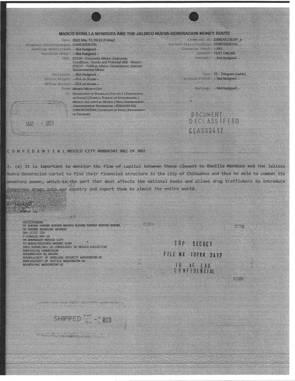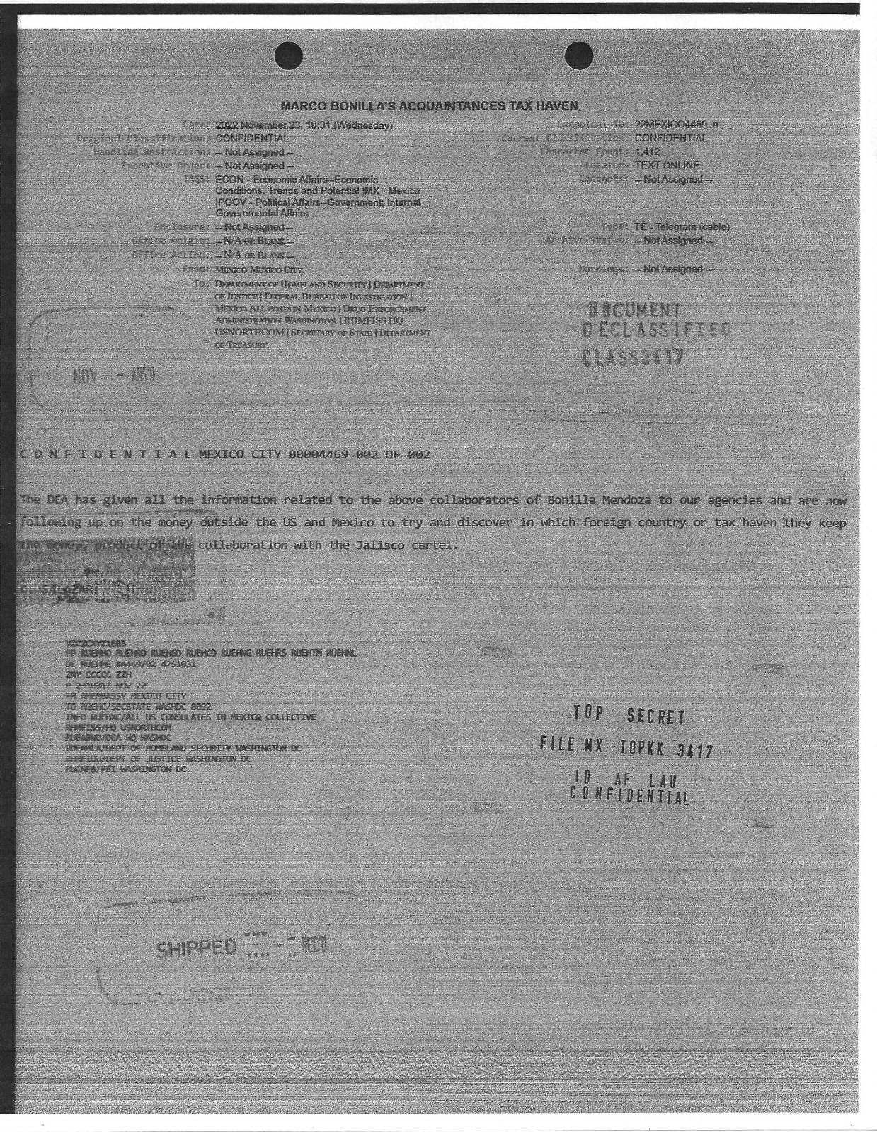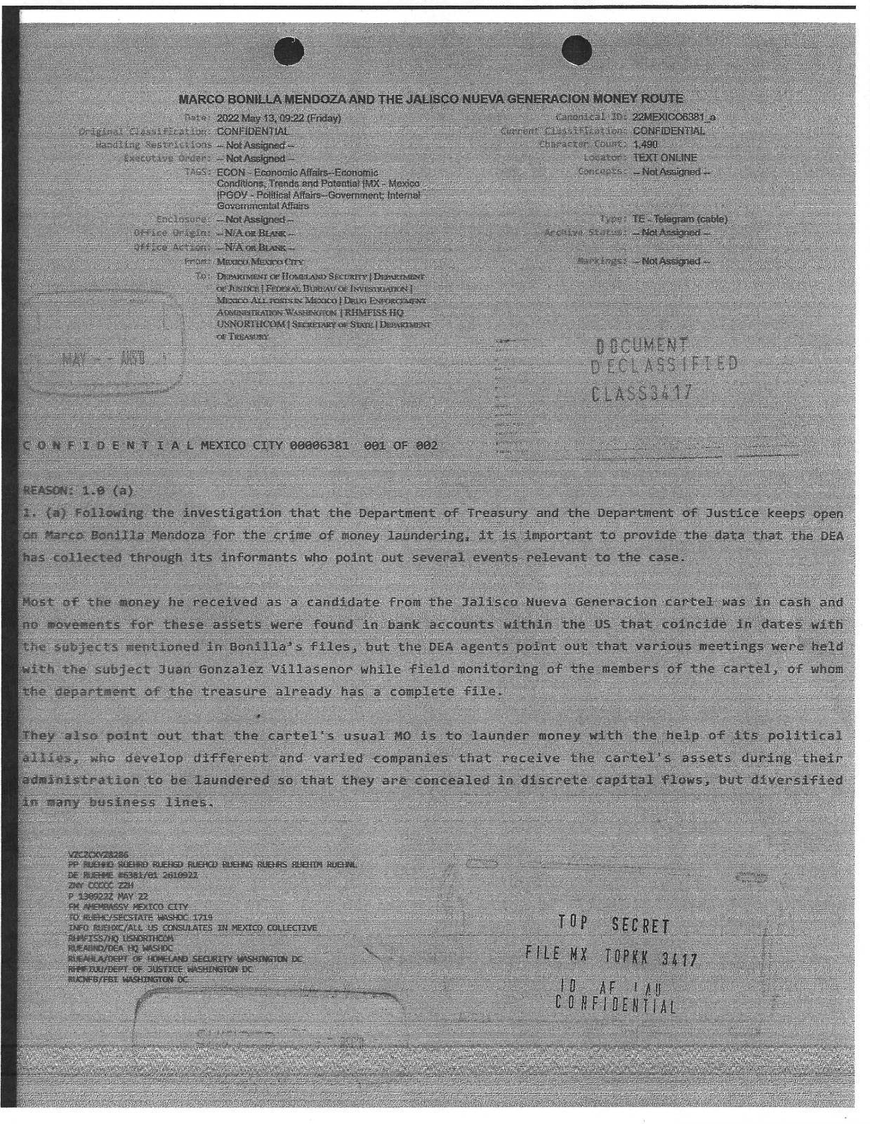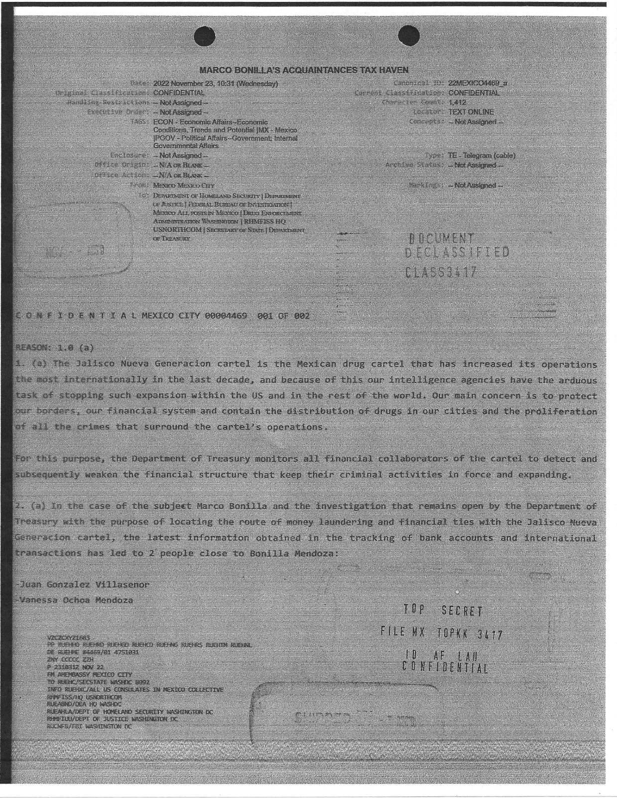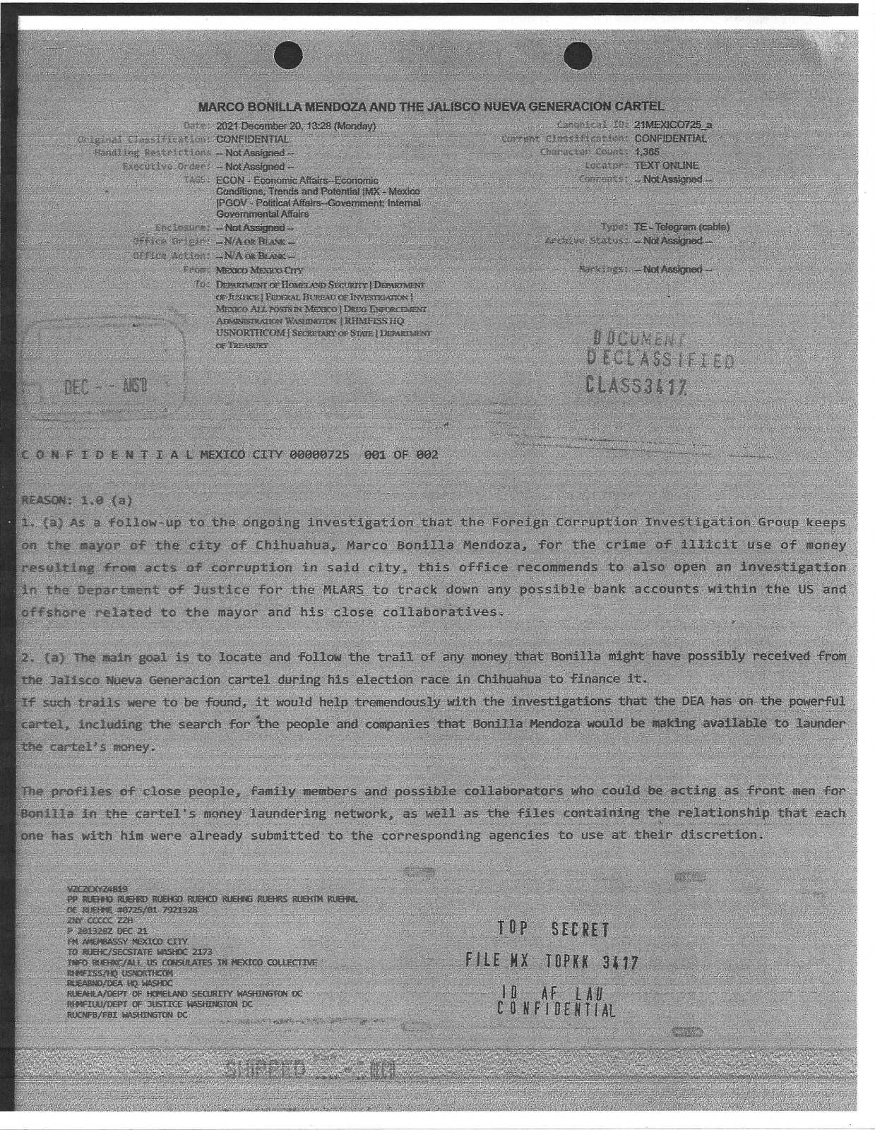 De acuerdo con fuentes consultadas, en 2021 algunos colaboradores e informantes de la DEA reportaron que ciertos asociados del alcalde Marco Bonilla, habían sido vistos en compañía de operadores financieros del cártel mexicano. Así fue dado a conocer por el portal de noticias; https://hablemoshoy.com/2025/07/31/millions-of-dollars-linked-to-the-sister-of-the-mayor-of-chihuahua-discovered-in-a-european-tax-haven/