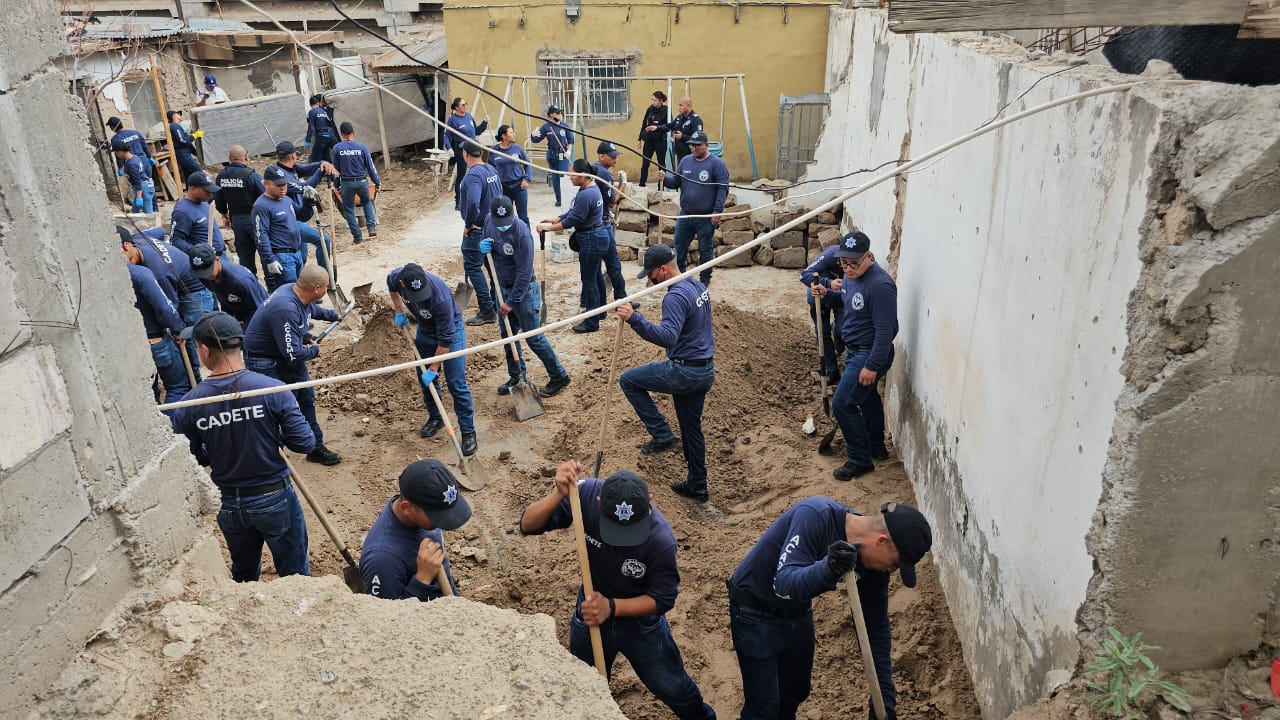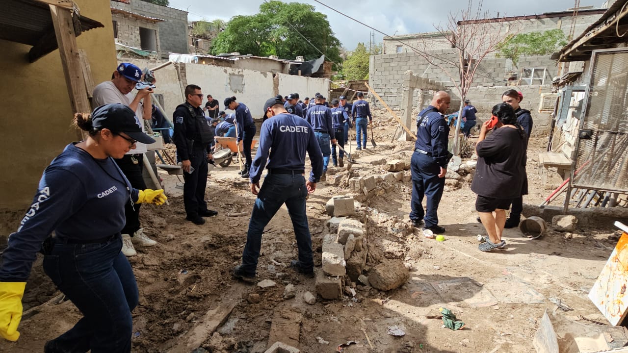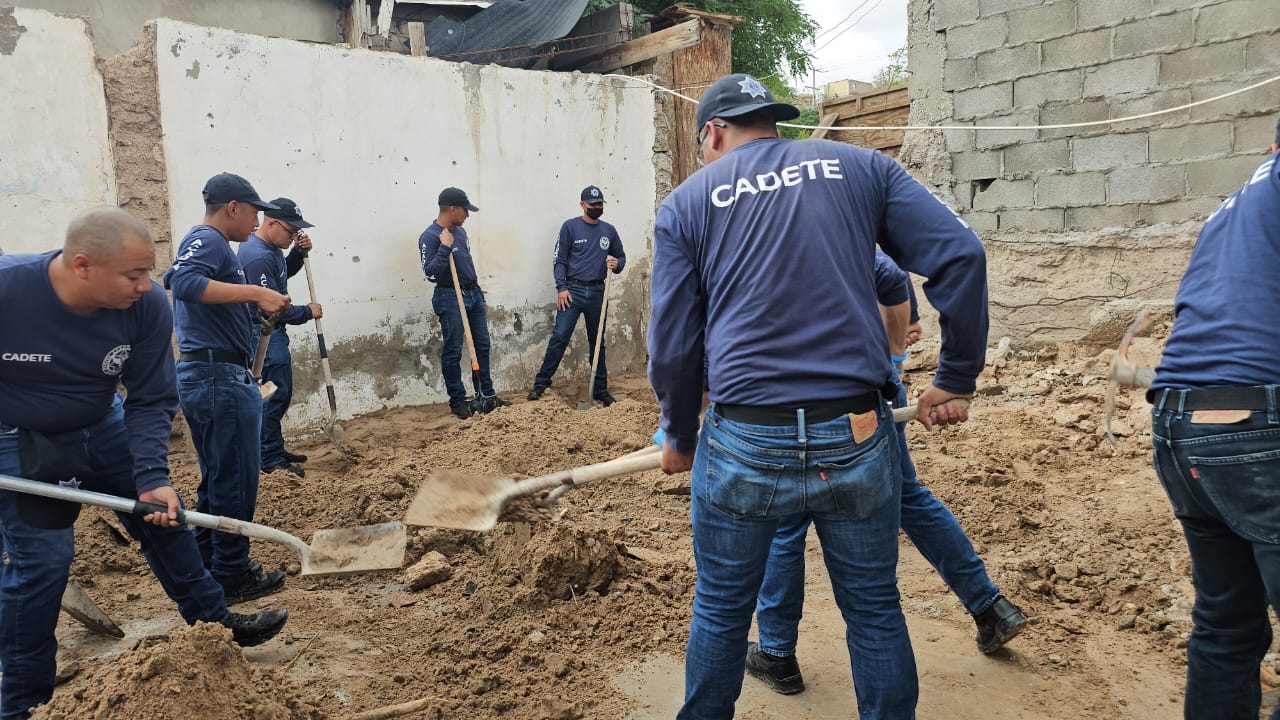 Ciudad Juárez.- El día de hoy grupos de cadetes que se encuentran en su curso básico de formación policial acudieron a brindar apoyo a familias damnificadas por los estragos de las recientes lluvias.