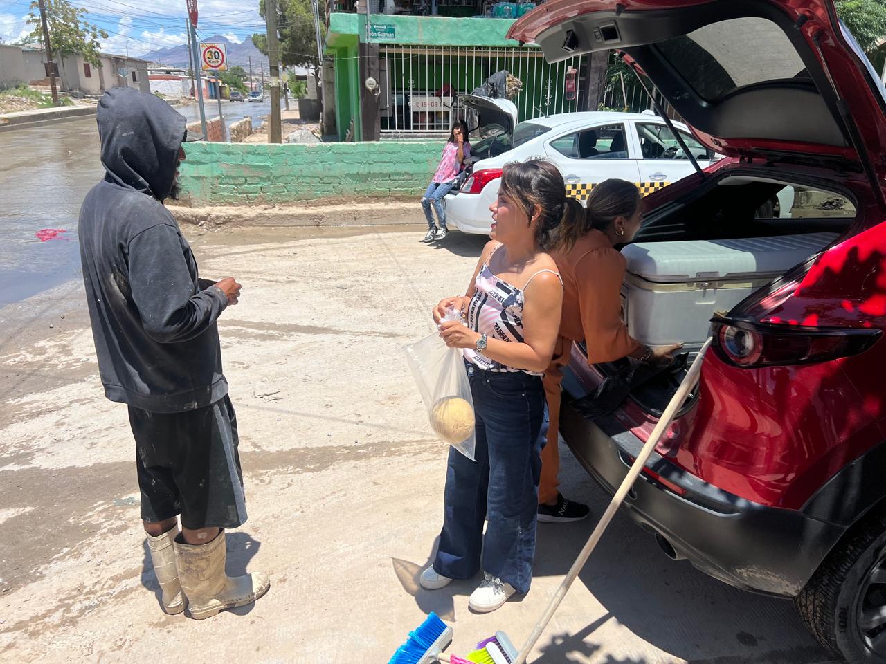 Durante esta segunda visita, la regidora llevó fruta fresca, agua embotellada, artículos de limpieza y bolsas de plástico gruesas para que los vecinos puedan proteger documentos y ropa que lograron rescatar tras las inundaciones.
