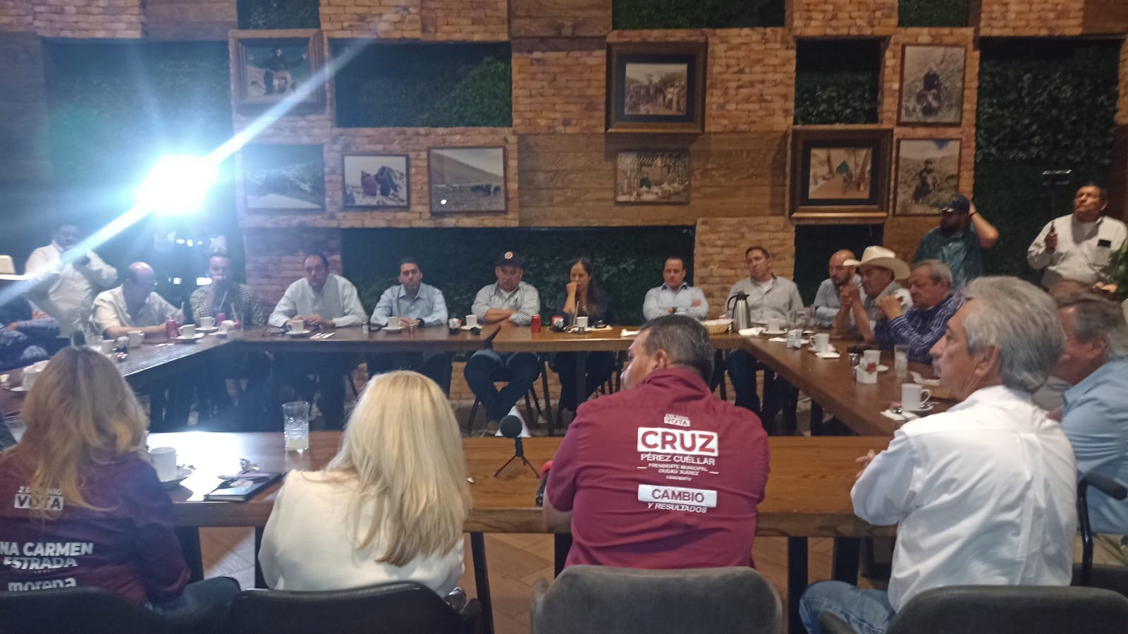 Ciudad Juárez.- Cruz Pérez Cuéllar, candidato a presidente municipal por la coalición Morena-PT , sostuvo una reunión con ganaderos locales, durante la cual escuchó sus preocupaciones y necesidades que ellos tienen para impulsar la industria de proteínas en la localidad. En respuesta, él se comprometió a reducir los burocratismos que dificultan su labor.