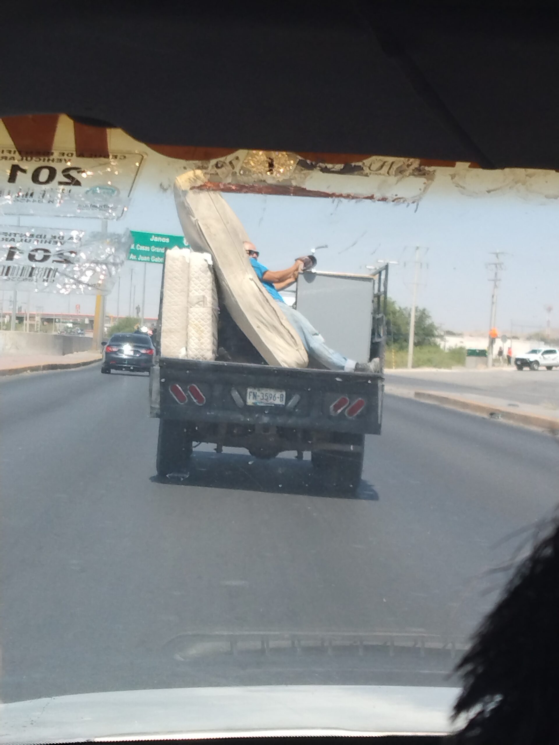 Ciudad Juárez.- Un hombre fue captado en video esta mañana atrás de una camioneta recostado sobre un colchón.