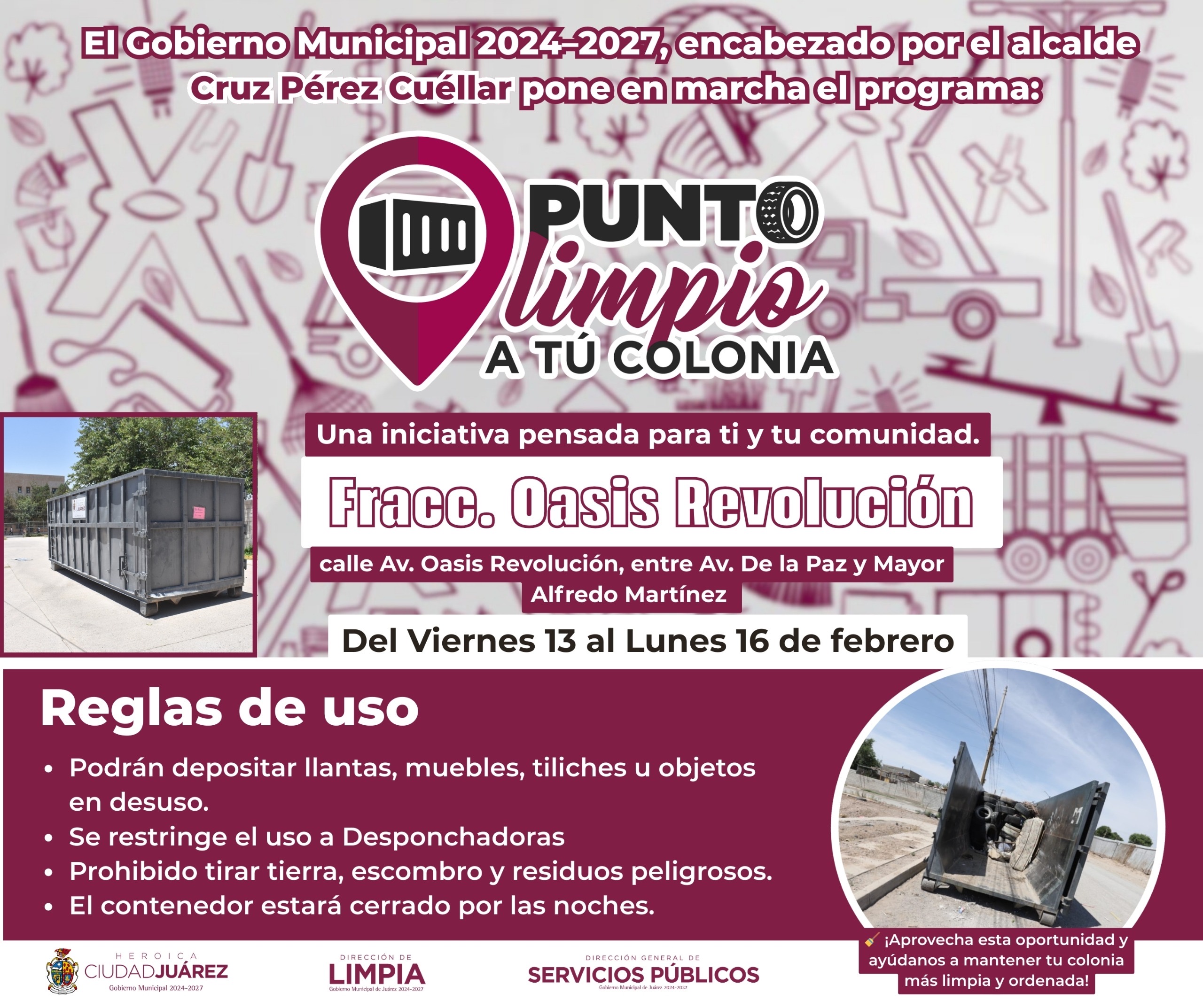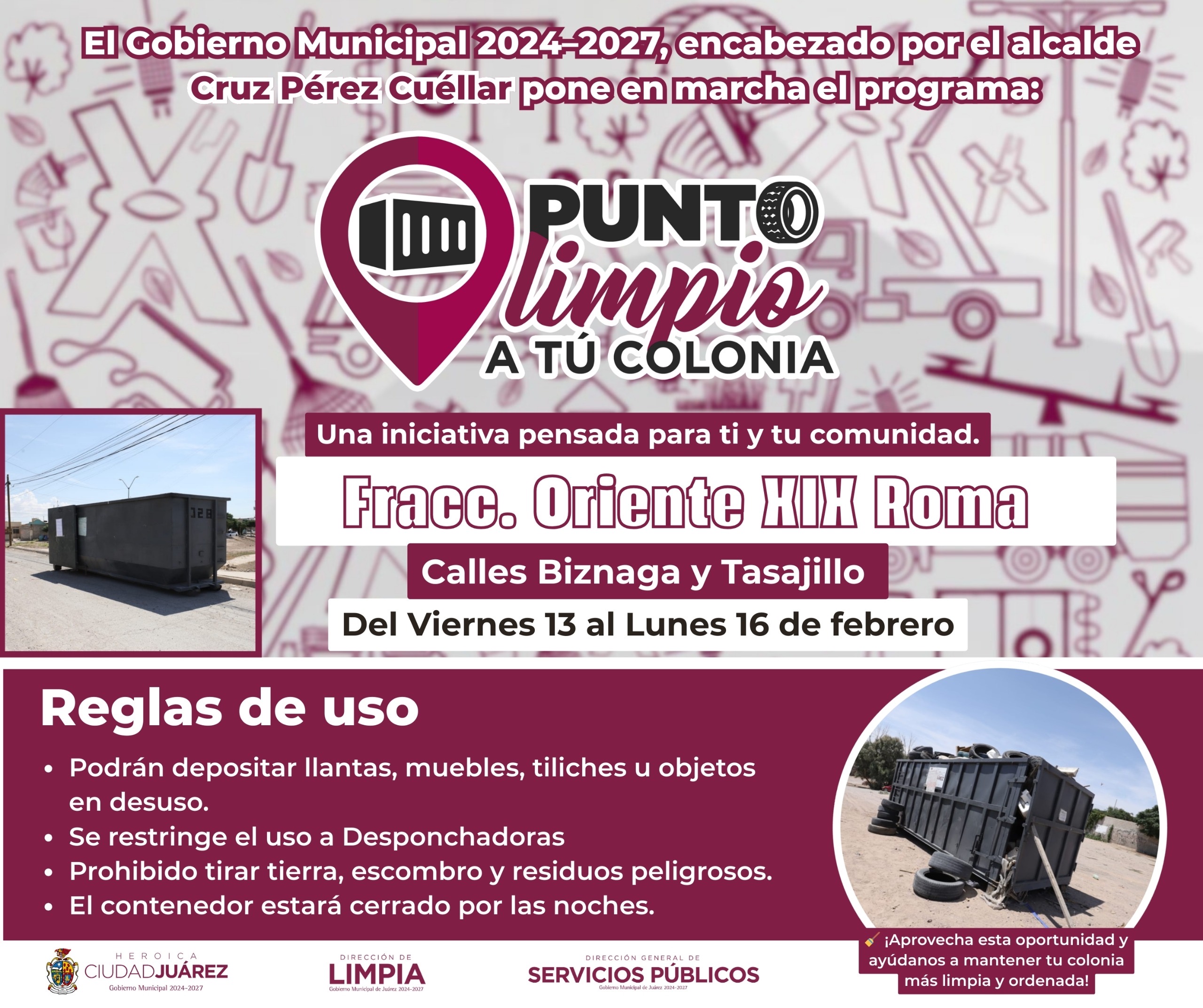 La Dirección de Limpia, invita a la ciudadanía a aprovechar los Puntos Limpios a tu Colonia, que se instalaron desde ayer y hasta el lunes 16 de febrero en distintos sectores de la ciudad, con el objetivo de facilitarle a la ciudadanía la correcta disposición de residuos de gran volumen.