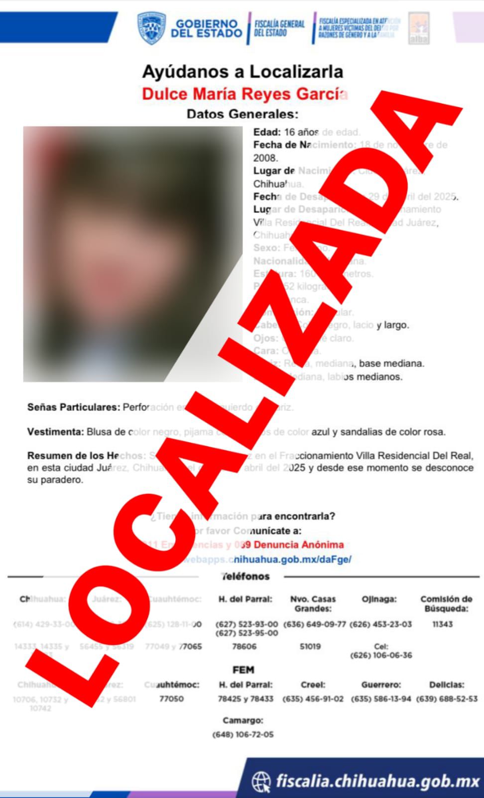 Elementos de la Fiscalía Especializada en Atención a Mujeres Víctimas del Delito por Razones de Género y a la Familia (FEM) de la Zona Norte, localizaron sanas y salvas a dos menores de edad de iniciales A.N.R.G., y D.M.R.G., quienes habían desaparecido desde el 29 de abril de 2025, en Ciudad Juárez.