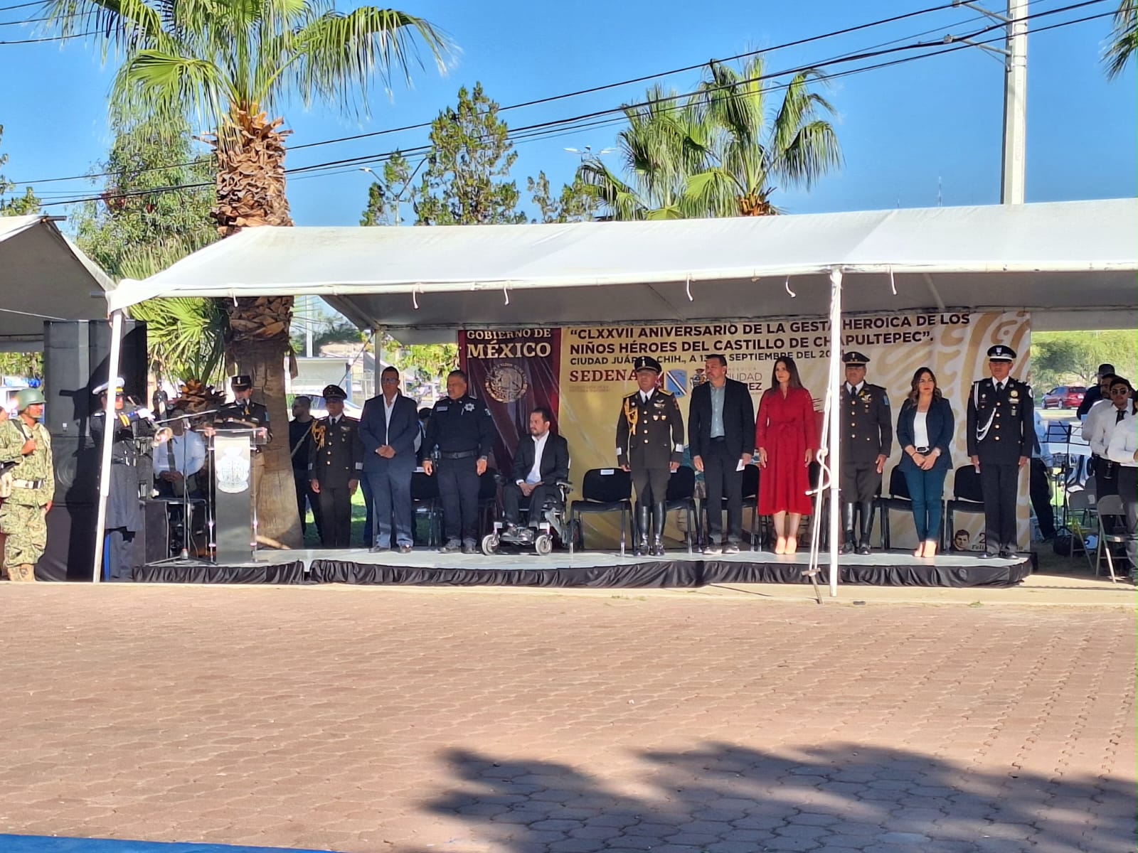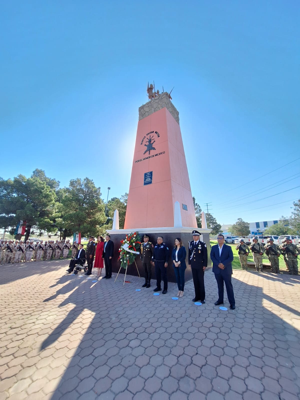 Durante el acto protocolario en el que se realizaron honores a la bandera, estuvieron presentes el General Brigadier de Estado Mayor, César Gutiérrez López, comandante de la Guarnición Militar de Juárez; el coordinador del de la Guardia Nacional en Juárez, Edgar Soto Lizárraga y el Presidente Municipal Cruz Pérez Cuéllar.