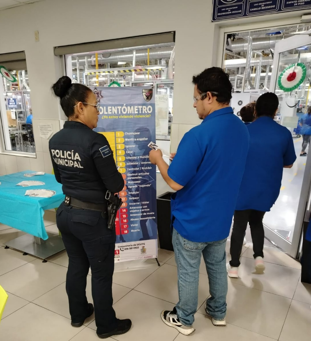 Ciudad Juárez-. Elementos de la Secretaría de Seguridad Pública Municipal adscritos a la Dirección Especializada en Violencia Familiar y de Género (DEVIFG), acudieron a las instalaciones de la empresa maquiladora Harman Becker, con la finalidad de instalar un módulo informativo además de entregar trípticos en materia de violencia familiar.