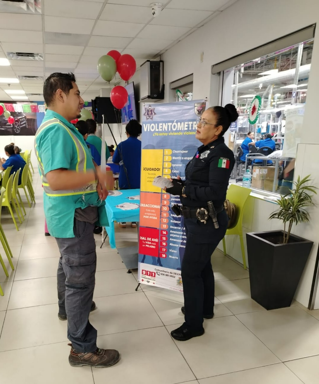 Lo anterior con el objetivo de que el personal que colabora en la empresa ubicada en el cruce de la avenida De las Torres y Sídney Harman, en el fraccionamiento Villas de Salvarcar, conozcan de primera mano los diferentes tipos de violencia y aprenda a identificarlos, además de una explicación breve sobre el violentometro para evitar con ello ser víctimas de tal delito en su entorno familiar y social, y así fortalecer la prevención y fomentar comunidades más informadas.