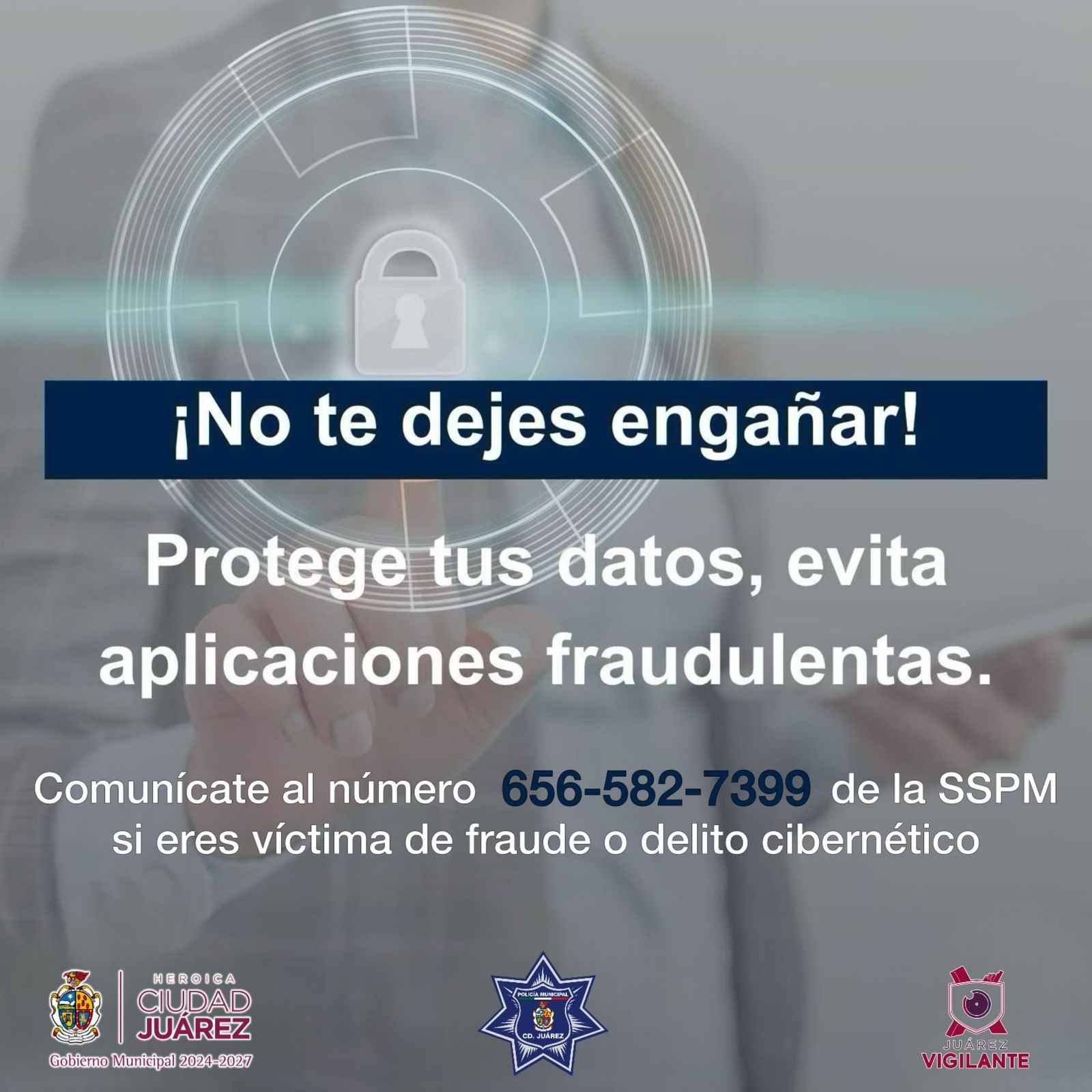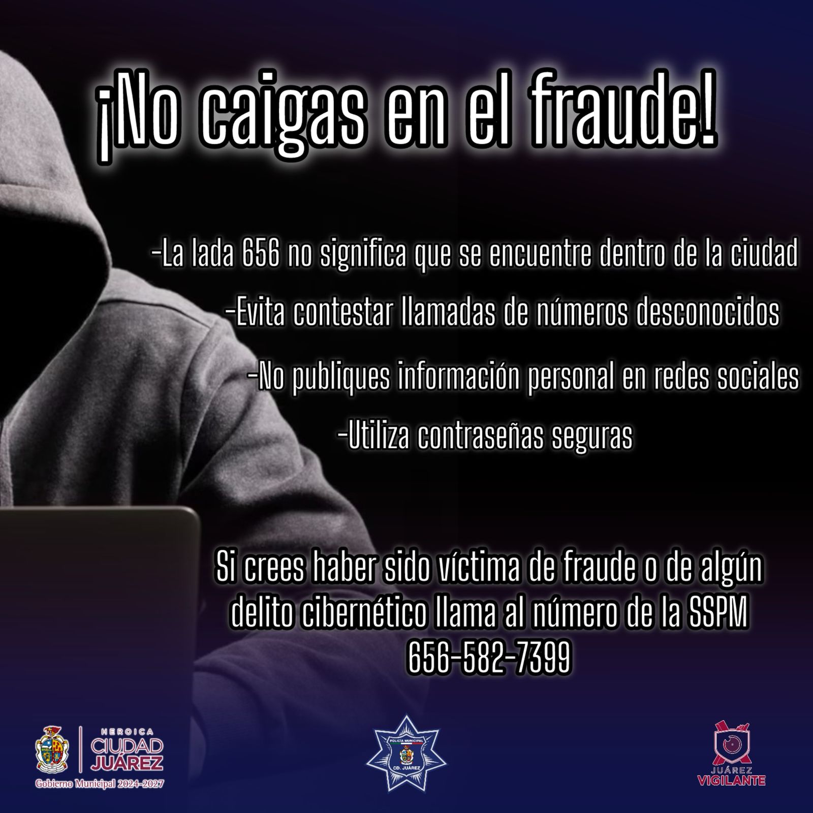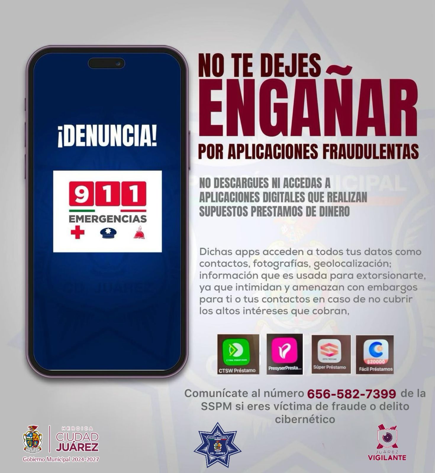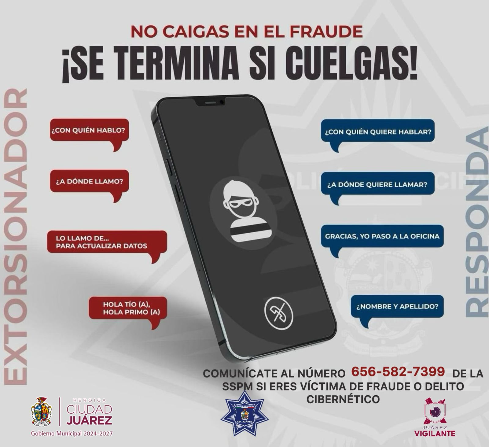 Ciudad Juárez.- La Secretaría de Seguridad Pública Municipal pone a disposición de la comunidad el número 656 582-73-99 al que puedan comunicarse en caso de ser víctimas de fraude telefónico.