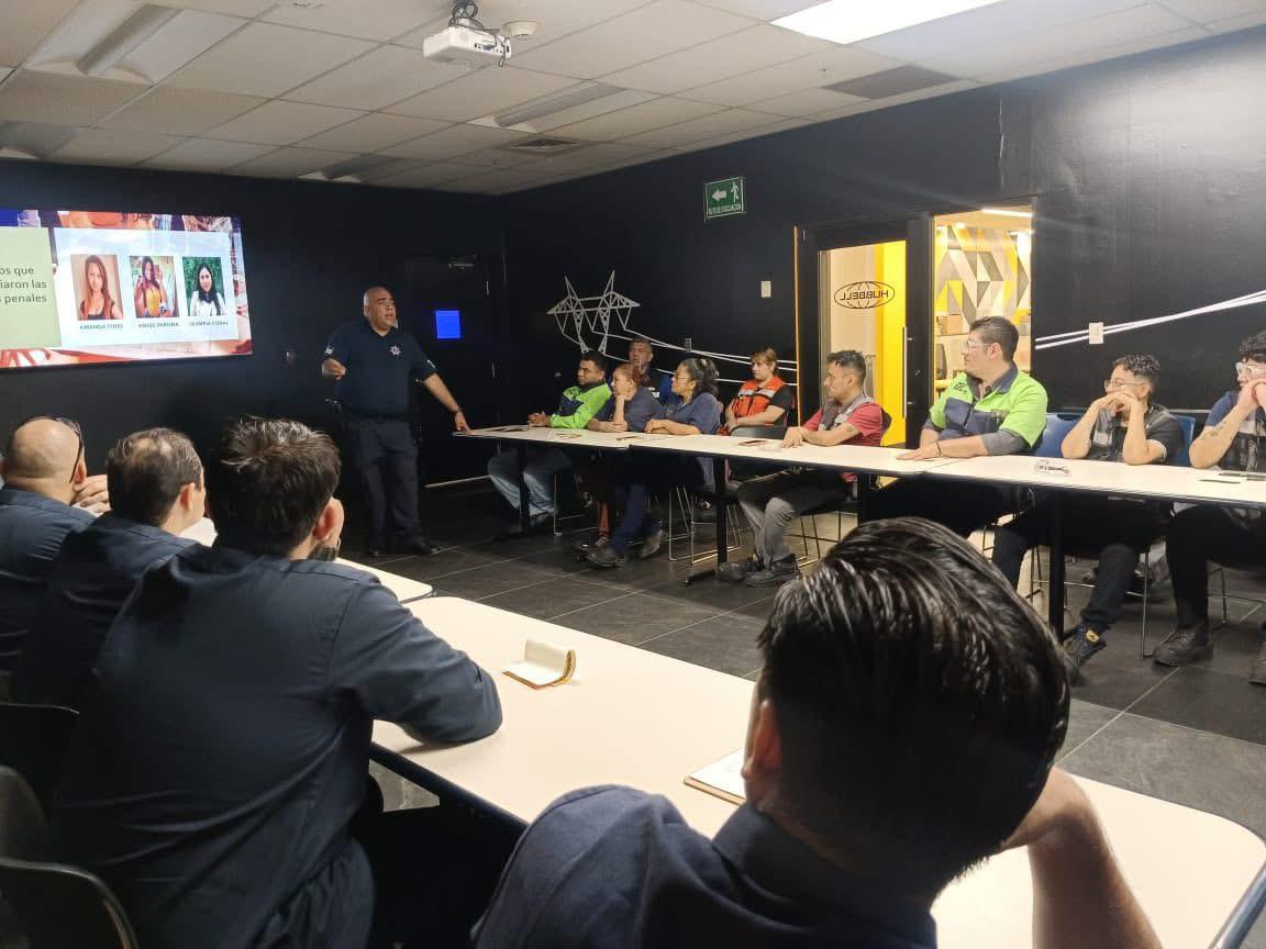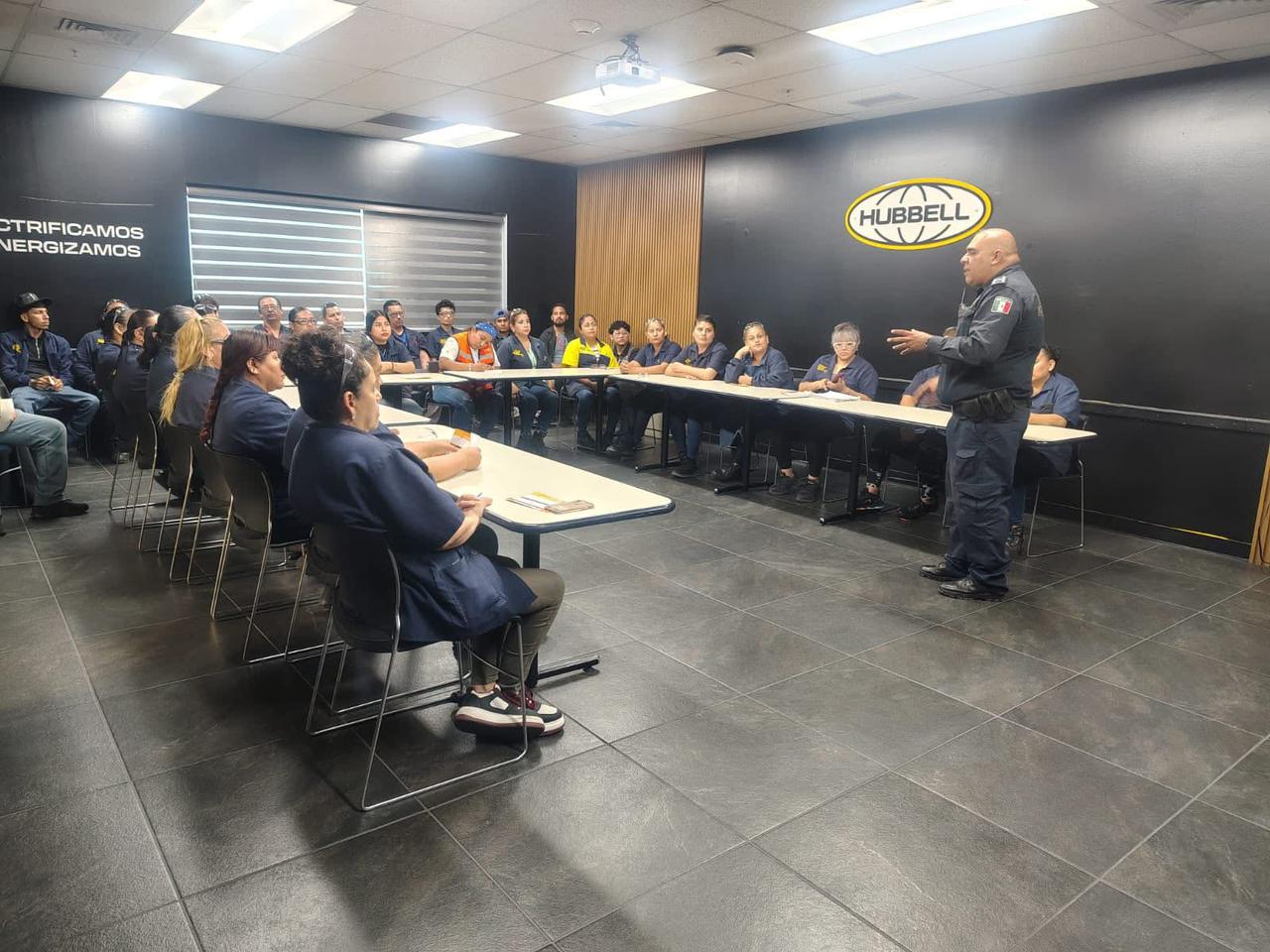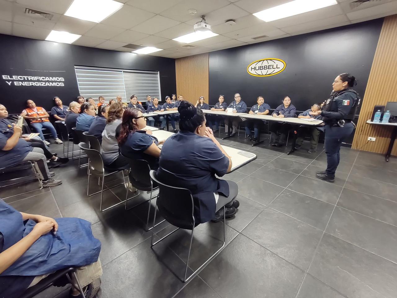 Ciudad Juárez.- Elementos de la Secretaría de Seguridad Pública Municipal a través de la policía de proximidad de la Dirección de Prevención Social, compartieron una plática preventiva a empleados de la empresa HUBBEL.