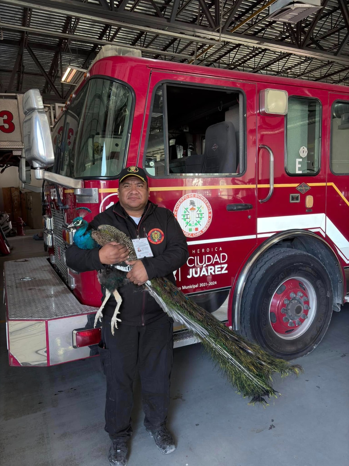 Ciudad Juárez.- Elementos de la Dirección de Bomberos de la ciudad llevaron a cabo el rescate de un Pavo Real que quedó atrapado en las ramas de un árbol en una escuela ubicada en la colonia El Futuro. El rescate fue posible gracias a una alerta de ciudadanos que llamaron al sistema de emergencias 911, según informó la dependencia municipal.