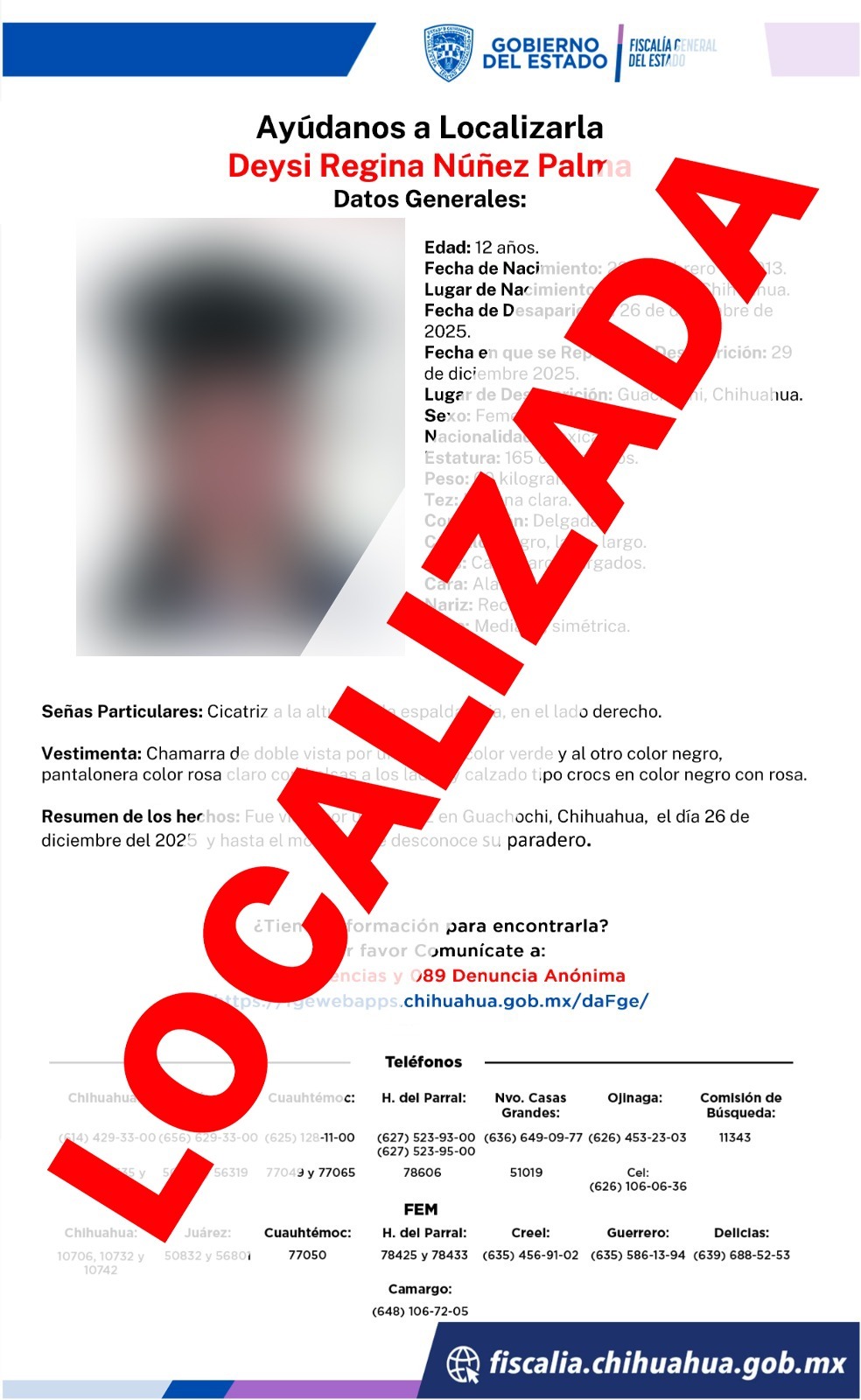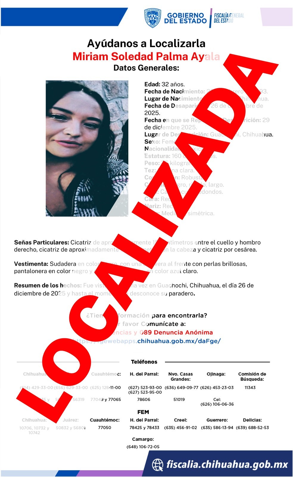 Elementos de la Agencia Estatal de Investigación localizaron sanas y salvas a madre e hija que contaban con reporte de ausencia y/o extravío, interpuesto el pasado lunes 29 de diciembre en el municipio de Guachochi.