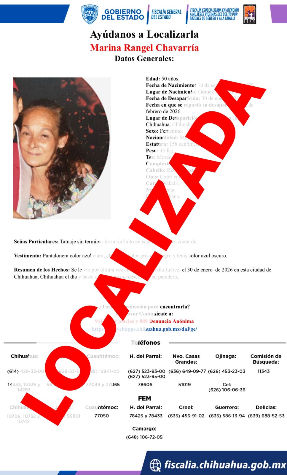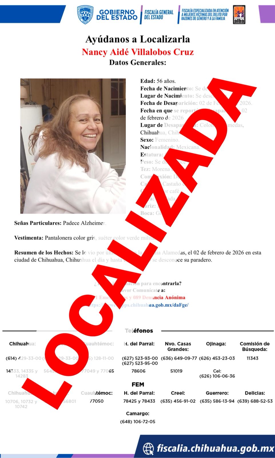 Por otra parte, también se reportó la localización de Nancy Aidé V. C., de 56 años, en buen estado físico y mental. Había sido reportada ausente en la colonia Alamedas, también de la ciudad de Chihuahua, el pasado 02 de febrero.